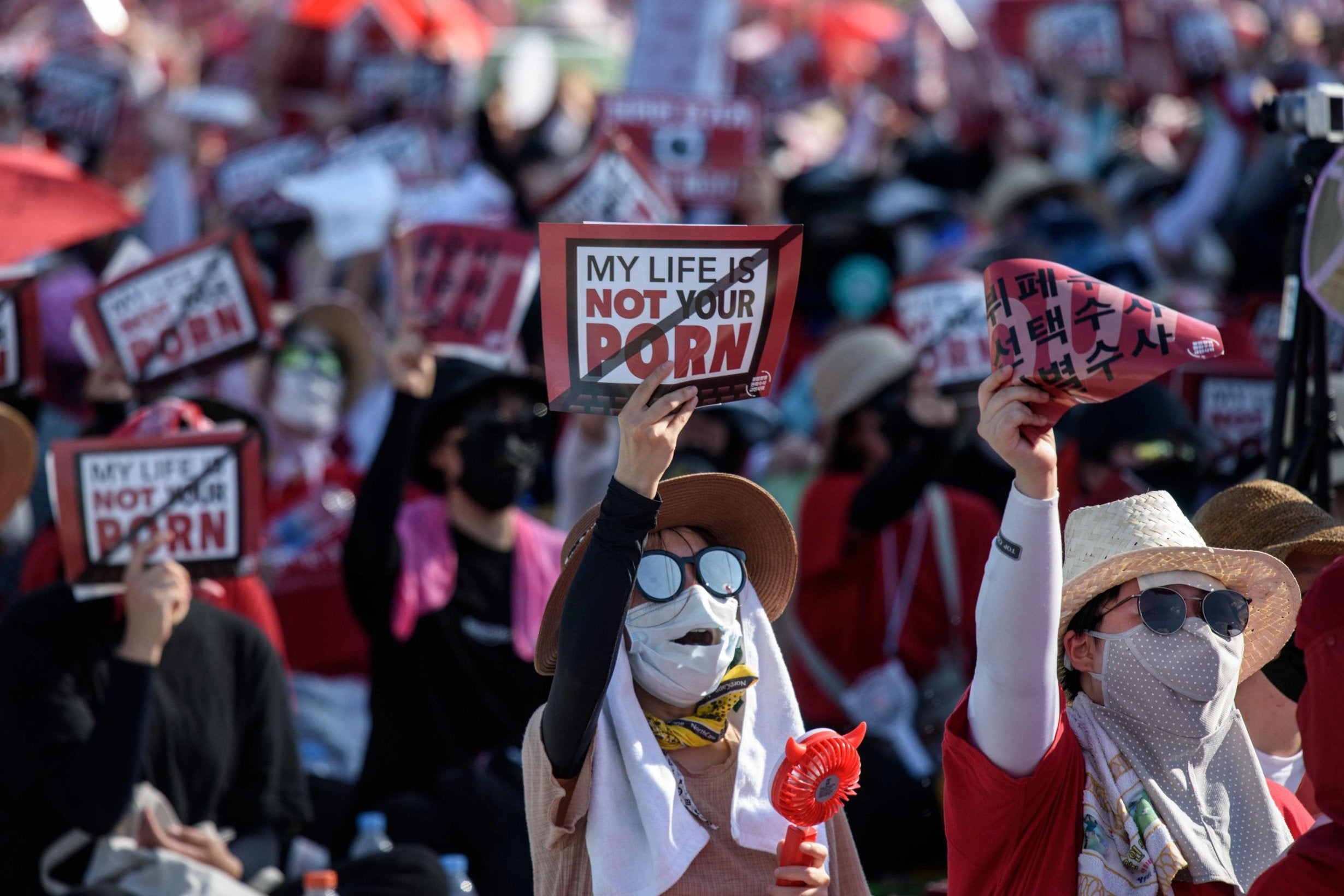 Nhiều người hô khẩu hiệu chống lại nội dung khiêu dâm quay lén trong cuộc biểu tình ở Seoul, Hàn Quốc năm 2018. Ảnh: AFP. |