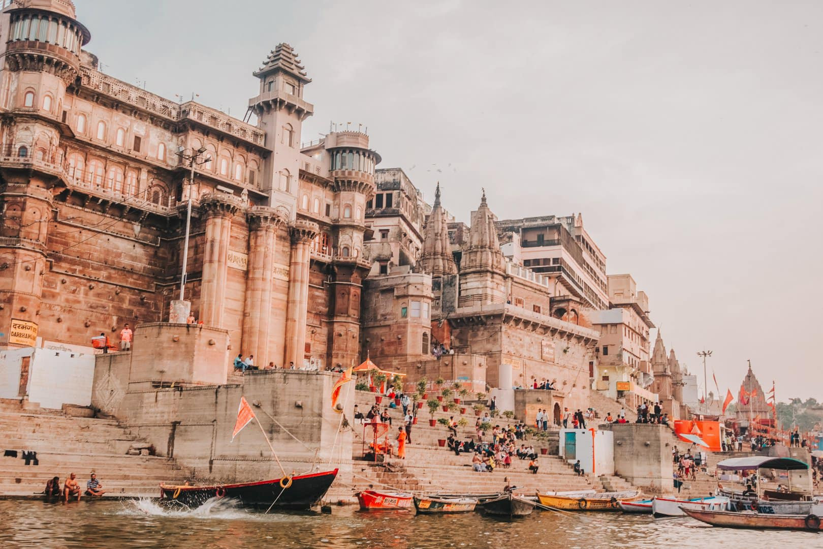 Dọc theo sông Hằng, người Ấn Độ dựng 87 ghat (những bậc thang dẫn xuống bờ sông) làm nơi cúng dường và tiến hành nghi lễ. Phần lớn các ghat phục vụ nhu cầu tắm rửa của dân chúng, một số khác là nơi cử hành nghi lễ hỏa táng người đã qua đời nhưng chỉ 2 ghat được phép tiến hành hỏa thiêu (Ảnh: Hang Bui).