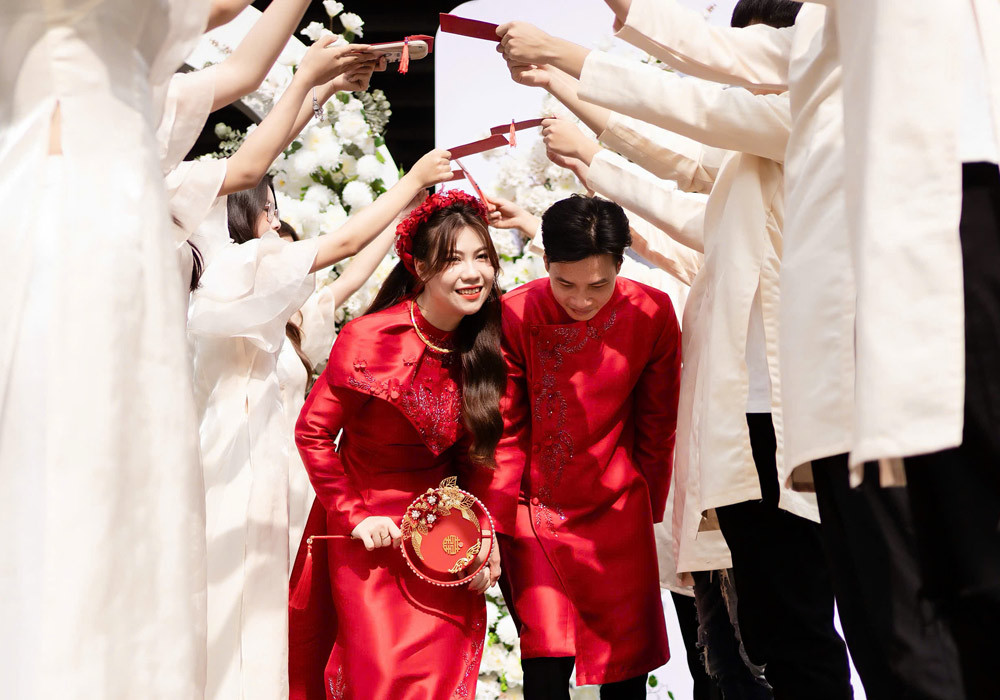 Thay vì rước dâu bằng xe hoa, Trọng Nghĩa đi bộ đón vợ về dinh. Chú rể đã có mặt ở nhà gái, đoàn đưa dâu vẫn ngồi bên sân nhà trai. Cô dâu cũng chỉ cần bước vài bước chân là đến cổng nhà chồng.