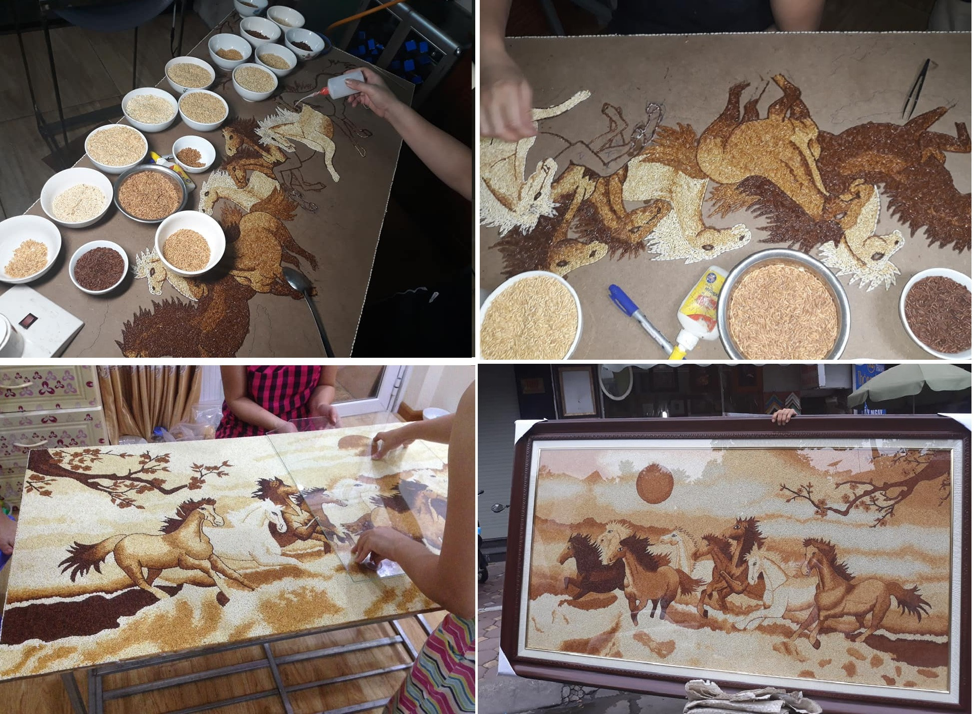 Tùy theo bố cục, hình ảnh mà chị chọn tông màu hạt gạo khác nhau. Cứ như vậy, người thợ làm tranh gạo phải thật kiên trì, tỉ mỉ xếp từng hạt gạo cho tới khi hoàn thiện bức tranh.