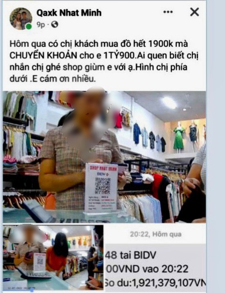 Sau khi mua quần áo với số tiền 1,9 triệu đồng, người phụ nữ này thanh toán bằng chuyển khoản cho chị Huyền. Tuy nhiên, thay vì chuyển 1,9 triệu thì người này chuyển 1,9 tỷ đồng vào tài khoản cá nhân của chị Huyền mà không hề hay biết.