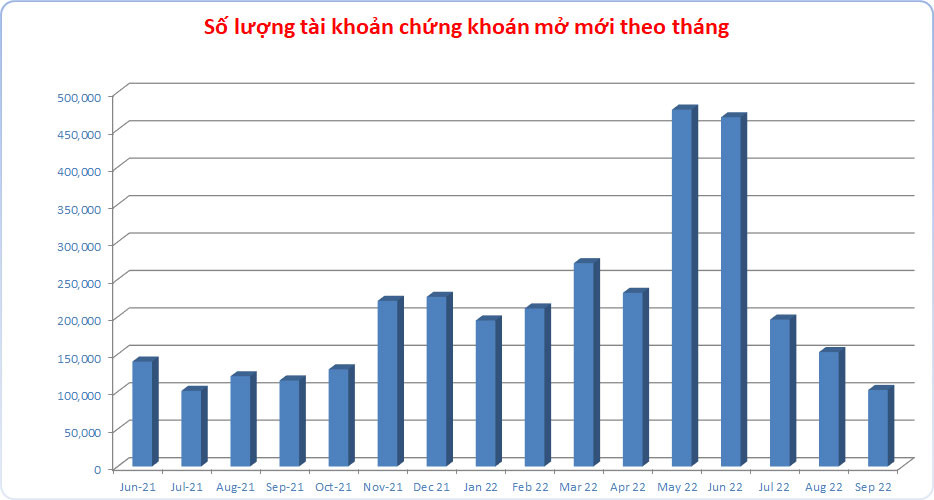 Thanh khoản thấp còn được thể hiện ở số lượng tài khoản mở mới trong tháng 9 tụt giảm xuống mức thấp nhất kể từ tháng 7/2021. Theo số liệu từ Trung tâm lưu ký Chứng khoán Việt Nam (VSD), nhà đầu tư trong nước đã mở mới 102.244 tài khoản chứng khoán trong tháng 9, giảm 34% so với tháng trước và chỉ bằng 1/5 so với giai đoạn bùng nổ hồi tháng 5-6/2022 - tháng thứ 3 liên tiếp sụt giảm mạnh.