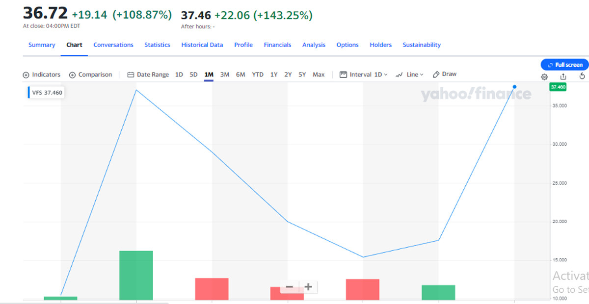 Đóng cửa phiên 22/8 (rạng sáng 23/8 giờ Việt Nam), cổ phiếu VinFast (VFS) tăng gần gấp đôi so với phiên liền trước lên 36,72 USD/cp. Trong phiên có lúc cổ phiếu VFS phá ngưỡng 40 USD.