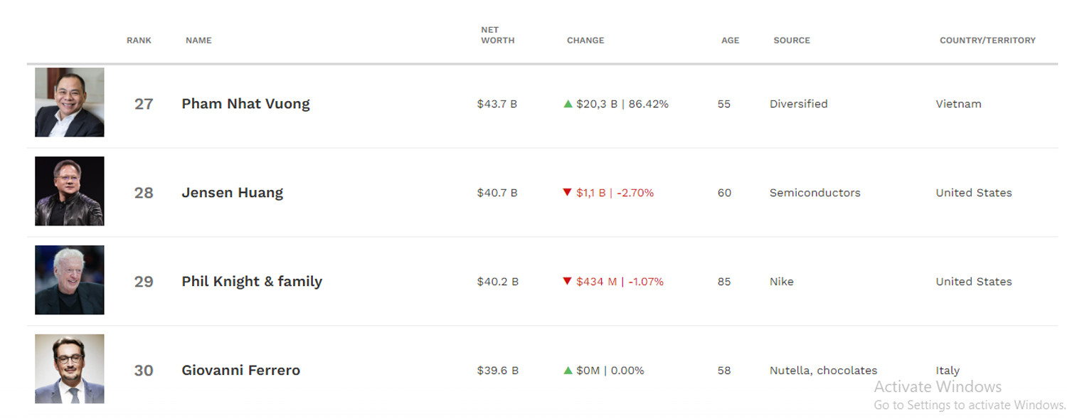 Cú tăng giá mạnh của VFS giúp tài sản của tỷ phú Phạm Nhật Vượng tăng thêm 20,3 tỷ USD lên 43,7 tỷ USD. Với khối tài sản này, tỷ phú Phạm Nhật Vượng xếp thứ 27 trong danh sách những người giàu nhất hành tinh của Forbes.