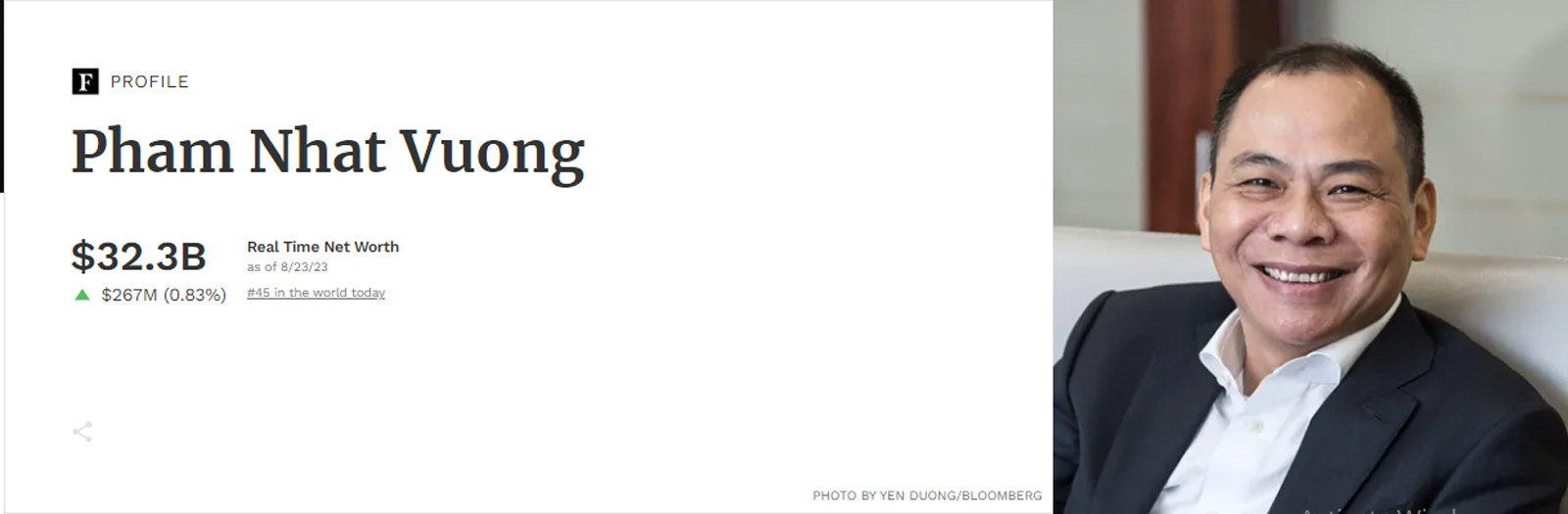 Mặc dù cổ phiếu VinFast tăng lên đỉnh lịch sử trong phiên giao dịch 23/8 trên sàn chứng khoán Nasdaq nhưng sau phiên giao dịch, Forbes xếp tỷ phú Phạm Nhật Vượng tụt 18 bậc, xuống vị trí giàu thứ 45 trên thế giới.