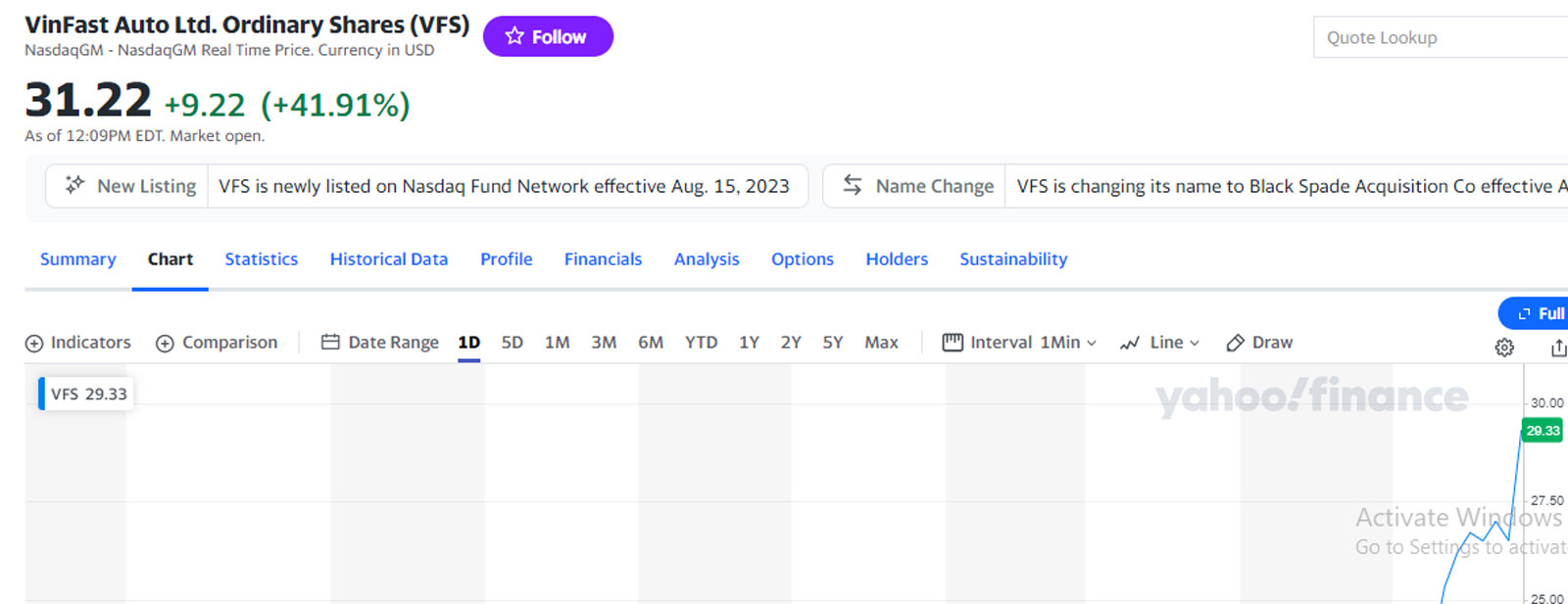 Tới 23h 09 ngày 15/8 (giờ Việt Nam), cổ phiếu VFS lên trên ngưỡng 30 USD/cp, vốn hóa tương đương hơn 69 tỷ USD.