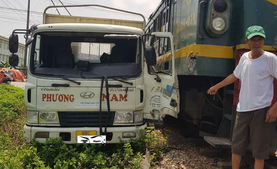 Ngay sau đó, đoàn tàu lao tới tông thẳng vào cabin xe tải. Cú tông mạnh khiến chiếc xe tải xoay 90 độ, văng sang bên đường. Rất may tài xế xe tải chỉ bị thương nhẹ.