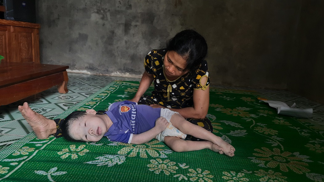 Son phải nằm một chỗ. Đến nay, dù đã 26 tuổi nhưng em chỉ nặng 12 kg, tay chân cong queo, không phát triển, không cử động được. Son không thể di chuyển hay nói cười mà chỉ nằm như một khúc gỗ. Ai đặt đâu, Son nằm đấy.