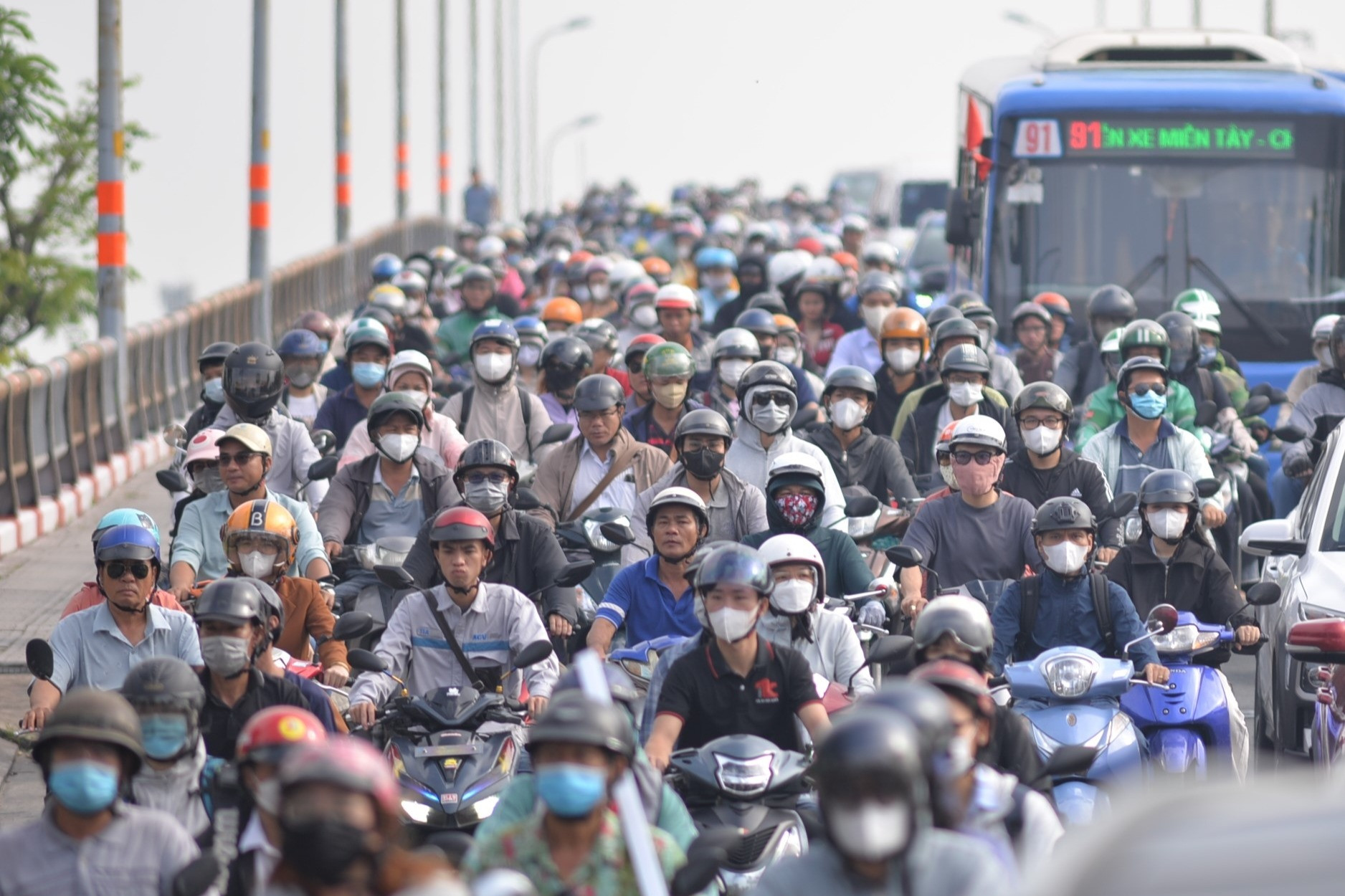 Trên cầu Bình Triệu 2 chật cứng xe máy, ô tô, xe buýt nối dài, nhích từng chút từng mét.