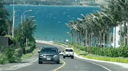Chụp ảnh từ con dốc, du khách có thể bắt trọn hình ảnh cung đường tấp nập xe cộ, phía xa là hồ nước trong xanh và núi non hùng vĩ. Những đoạn video check-in ở đây nhanh chóng thu hút triệu lượt xem trên các nền tảng mạng xã hội.