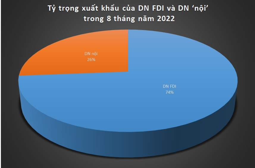 Còn trên bình diện cả nước, xuất khẩu của khu vực FDI nhiều năm gần đây chiếm tới trên 70% tổng kim ngạch xuất khẩu của cả nước, còn doanh nghiệp ‘nội’ chỉ chiếm phần nhỏ còn lại. Riêng xuất khẩu của 1 DN FDI như Samsung đã chiếm tới 16% tổng kim ngạch xuất khẩu cả nước năm 2021.