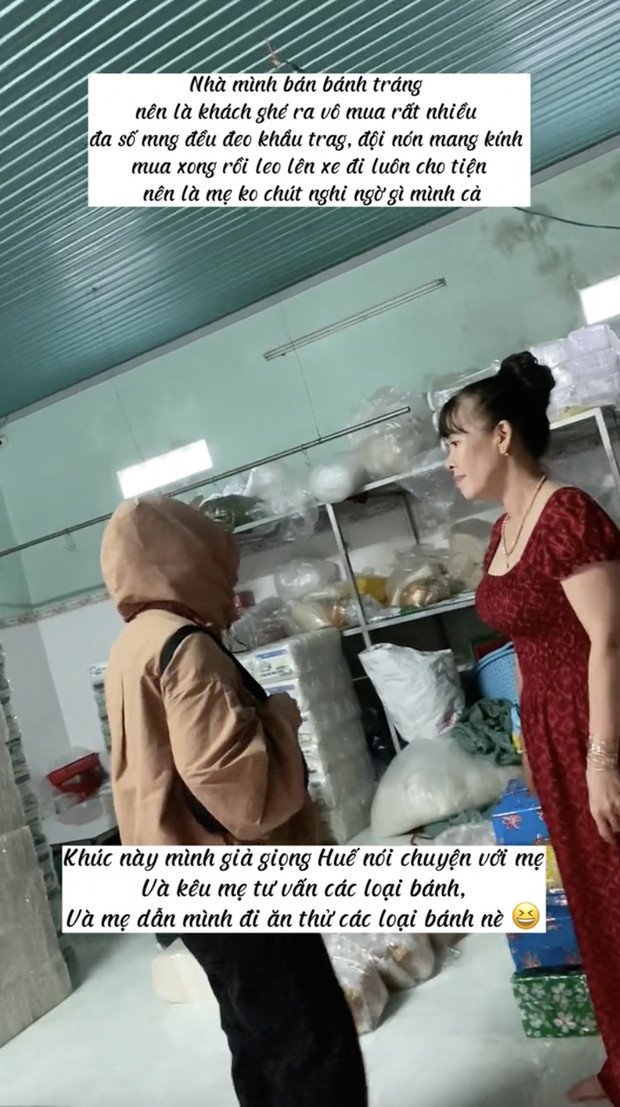 "Lúc vào mua hàng, mình bịt kín mặt, mặc áo chống nắng, đội mũ, đeo kính đen. Để mẹ tin, mình còn nói giọng Huế. Khi đó ở Tây Ninh thời tiết rất nóng nên việc mình đeo khẩu trang, kính râm và mặc áo chống nắng kín người không khiến mẹ tò mò, tiếp đãi bình thường", Nhi cho hay.