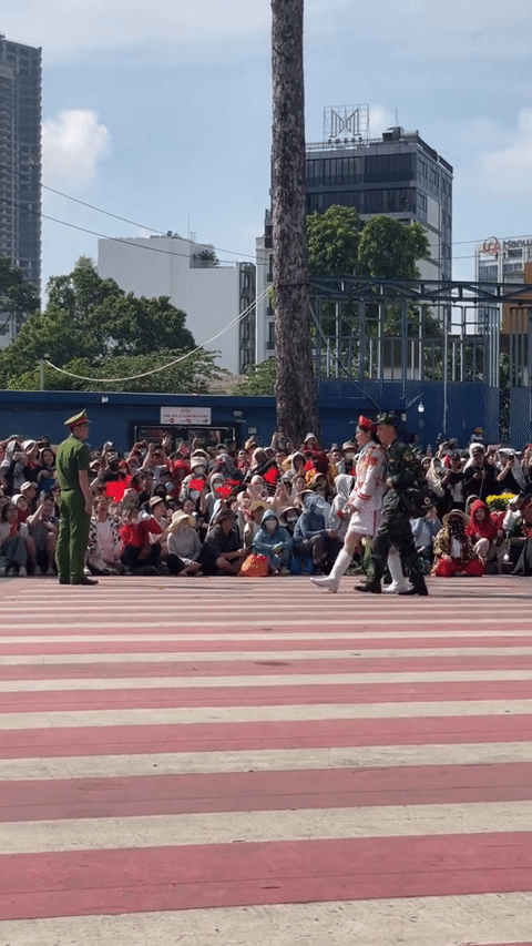 Trưa 26/4, bà Oanh đưa mẹ từ Biên Hòa đến TPHCM. Sáng 27/4, bà đẩy xe lăn đưa mẹ đến xem tổng duyệt diễu binh, diễu hành. Đến đoạn đường đông đúc, bà Oanh để lại xe lăn, cõng mẹ đi thêm mấy trăm mét tìm chỗ ngồi. Người dân hai bên đường vỗ tay rần rần, cổ vũ hai mẹ con.