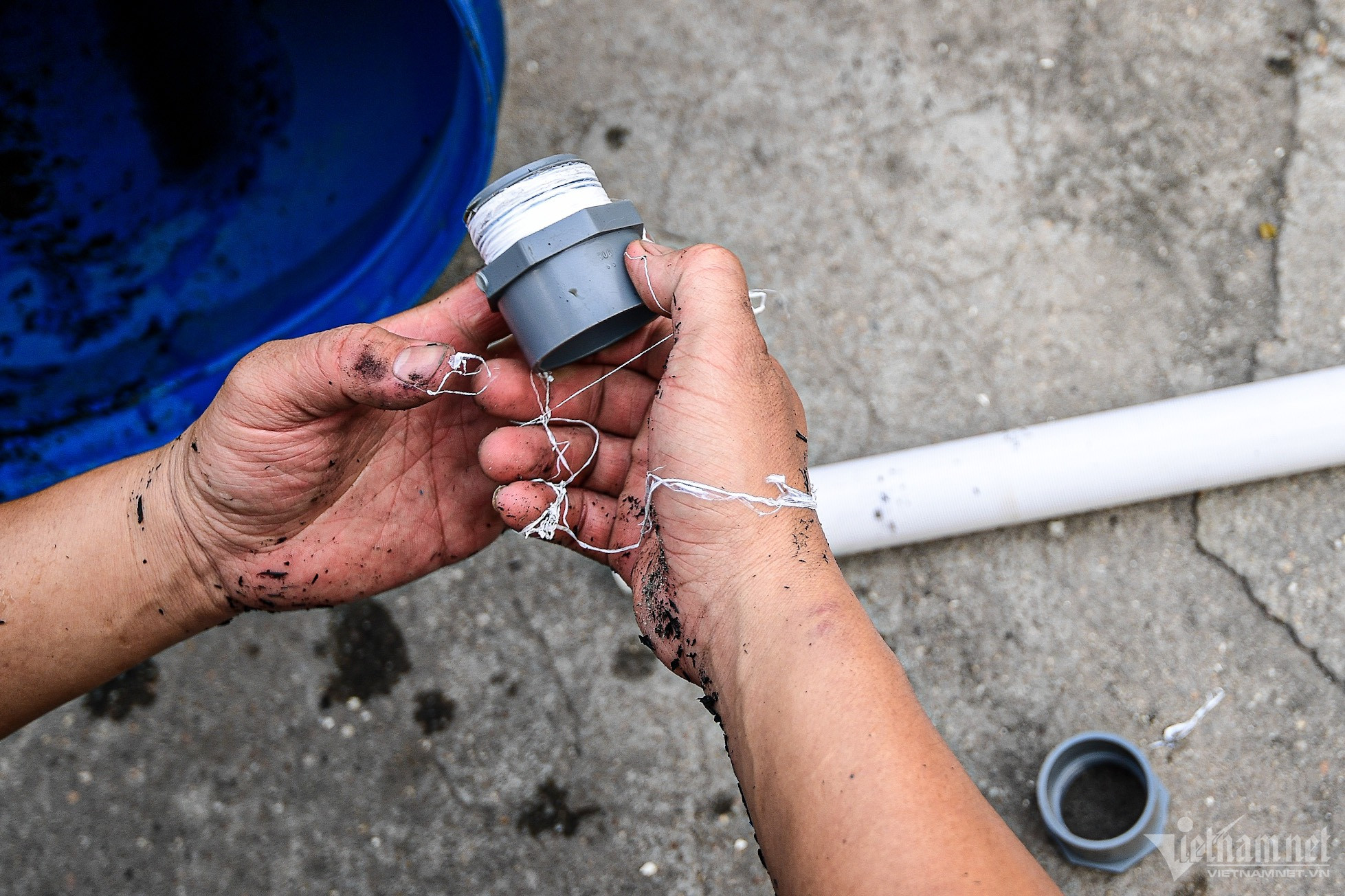 Anh Chiến (thôn Chiềng) không chịu được cảnh này đã đi mua trấu, cát và lưới lọc để chế ra bể lọc nước.