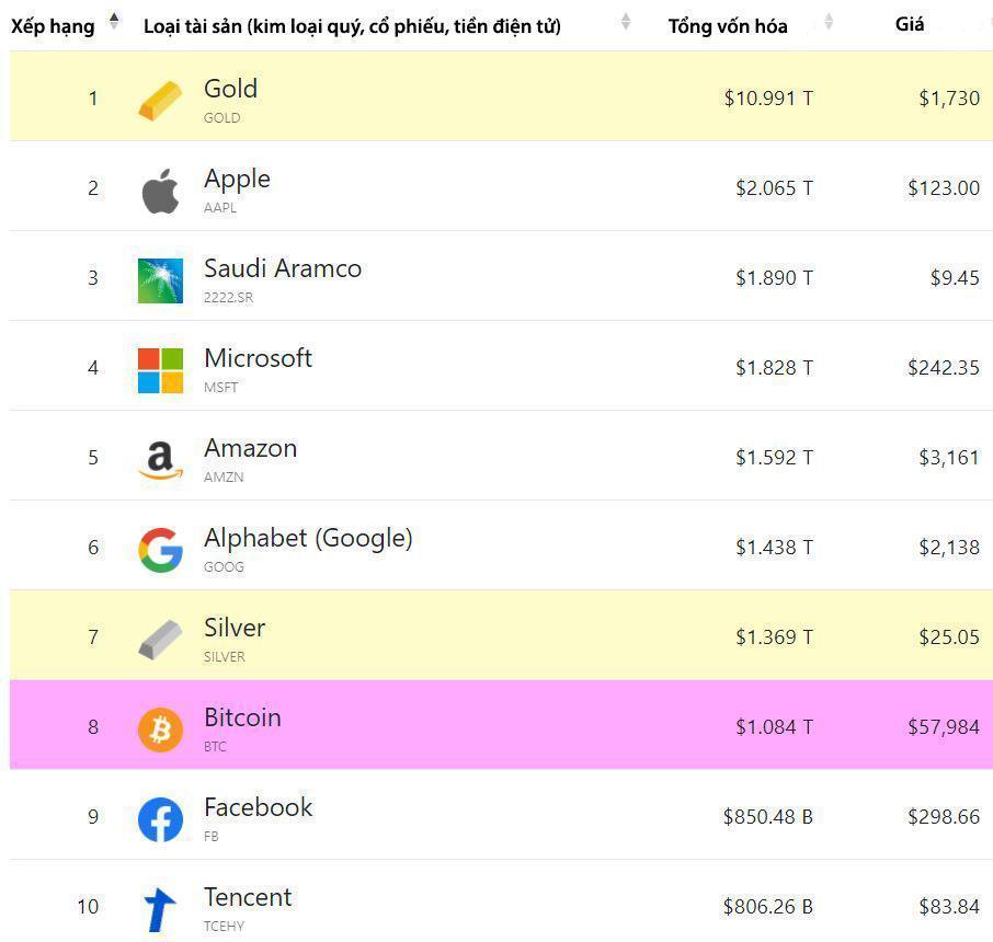Với tốc độ tăng giá như hiện nay, tổng vốn hóa của Bitcoin (1.076 nghìn tỷ) sắp vượt qua bạc (1.364 nghìn tỷ) để cạnh tranh về giá trị vốn hóa với cổ phiếu của Alphabet, Amazon và Microsoft.