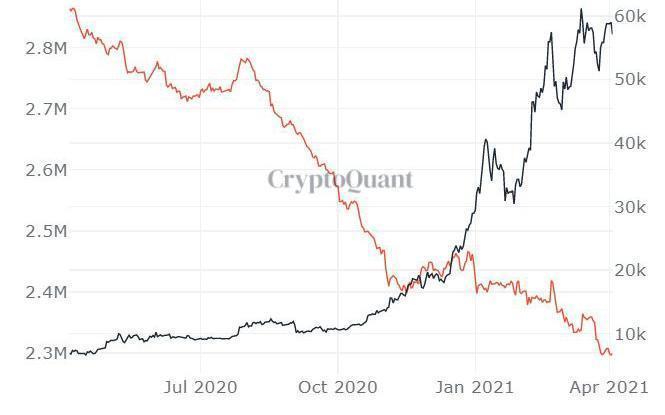 Biểu đồ về giá (đường màu đen) và lượng Bitcoin trên các sàn giao dịch (đường màu cam). Giá Bitcoin tăng lên theo thời gian trong khi lượng Bitcoin trên sàn đang giảm đi. Điều này cho thấy ngày càng nhiều người cất giữ Bitcoin như một loại tài sản thay vì đưa lên sàn để bán.