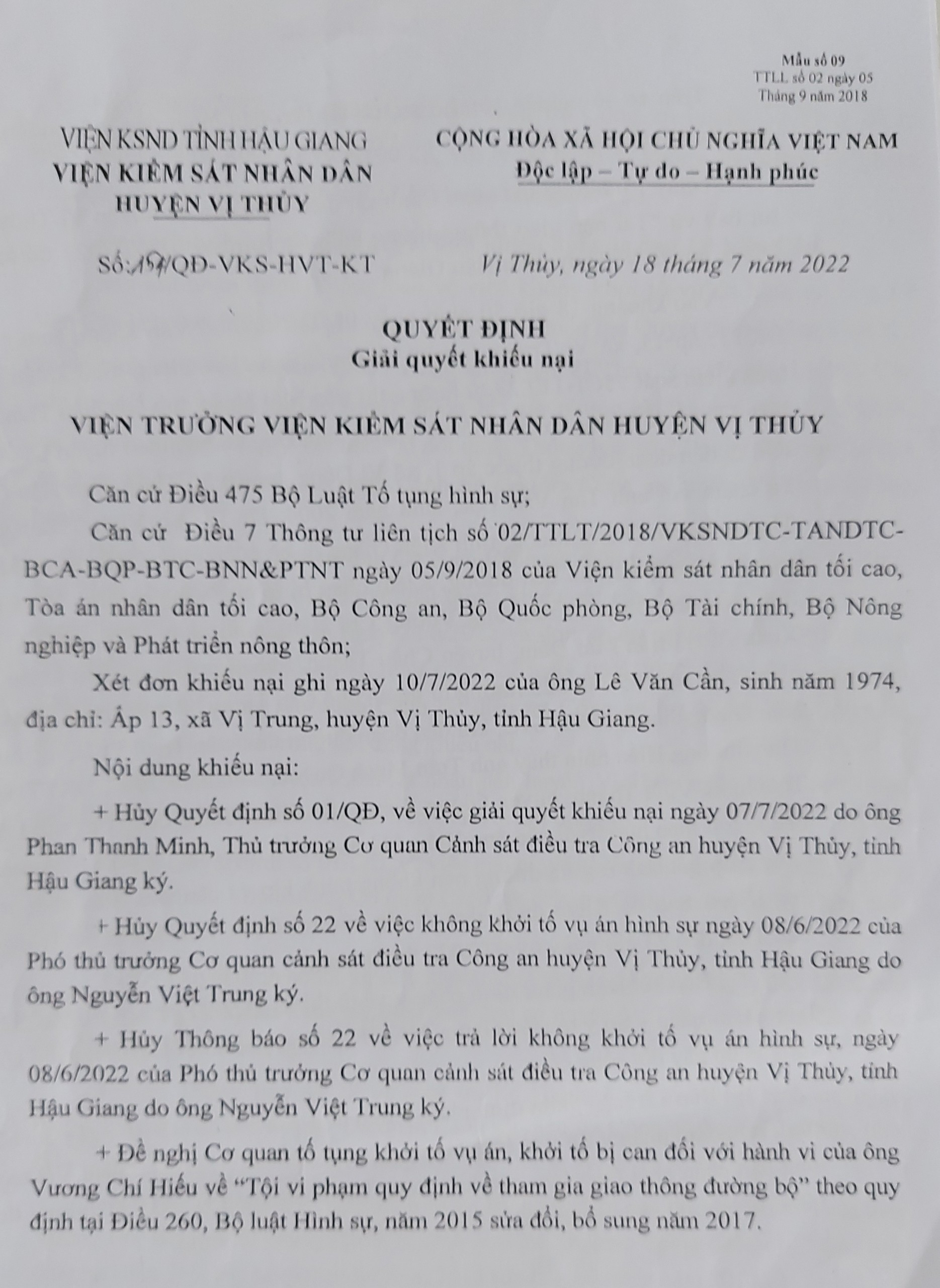 "Việc ông Lê Văn Cần cho rằng, ông Hiếu điều khiển xe tải va chạm với xe máy của con ông là Lê Văn Kiệm gây ra gãy đốt sống cổ dẫn đến tử vong là không đúng. Điều này thể hiện qua kết quả khám phương tiện liên quan đến TNGT không ghi nhận dấu vết vào để lại trên 2 phương tiện va chạm", quyết định giải quyết khiếu nại của cơ quan CSĐT huyện Vị Thủy nêu.