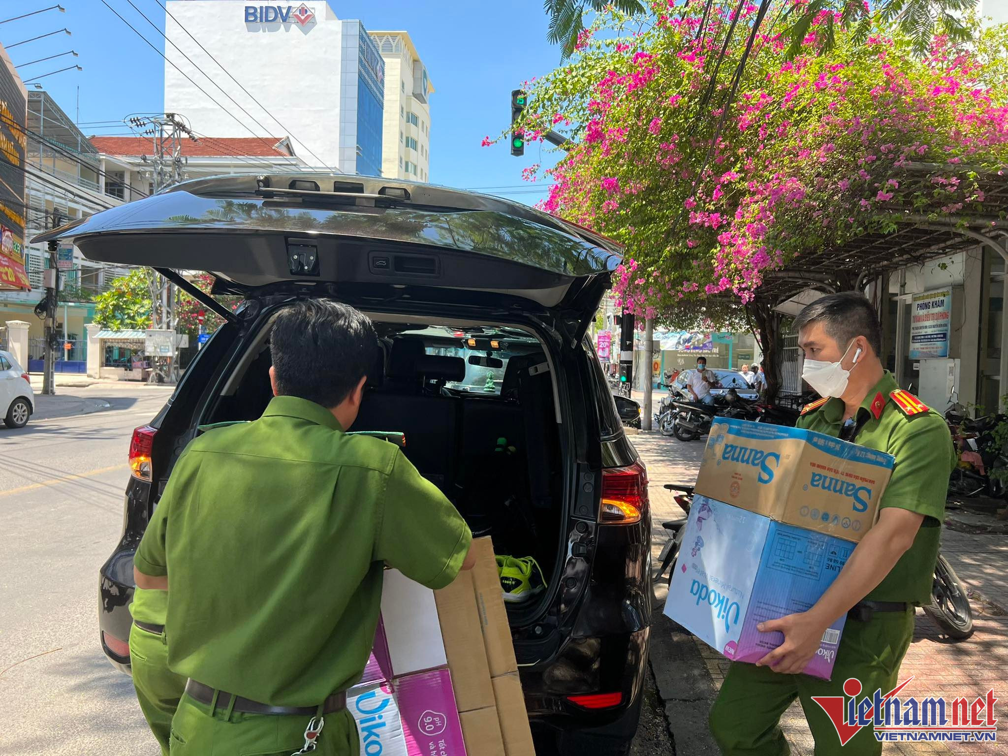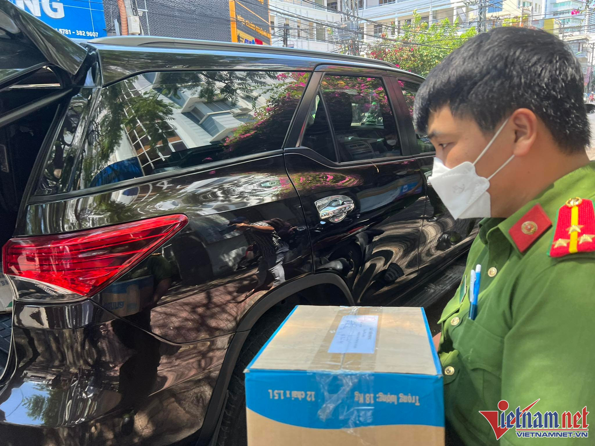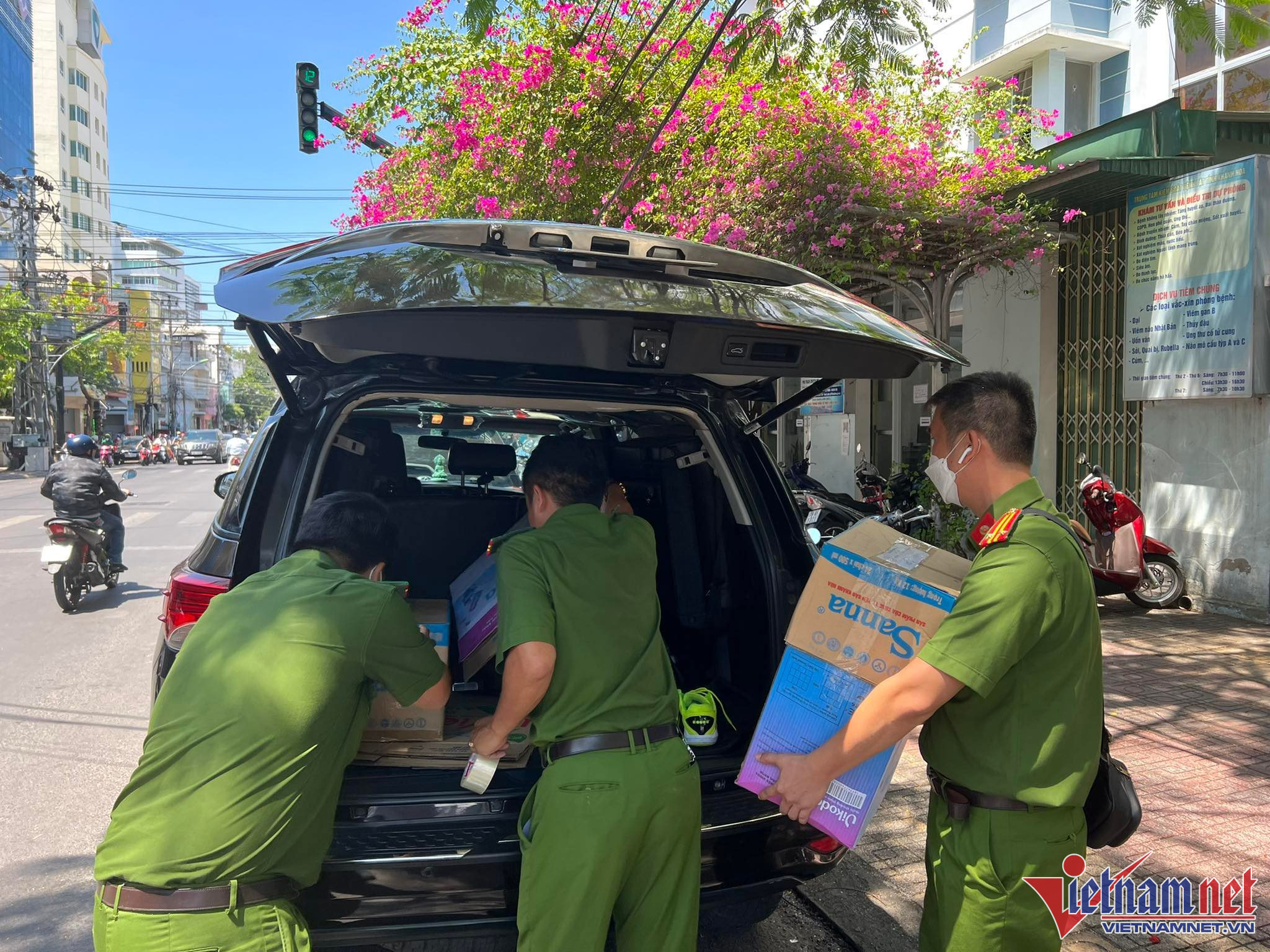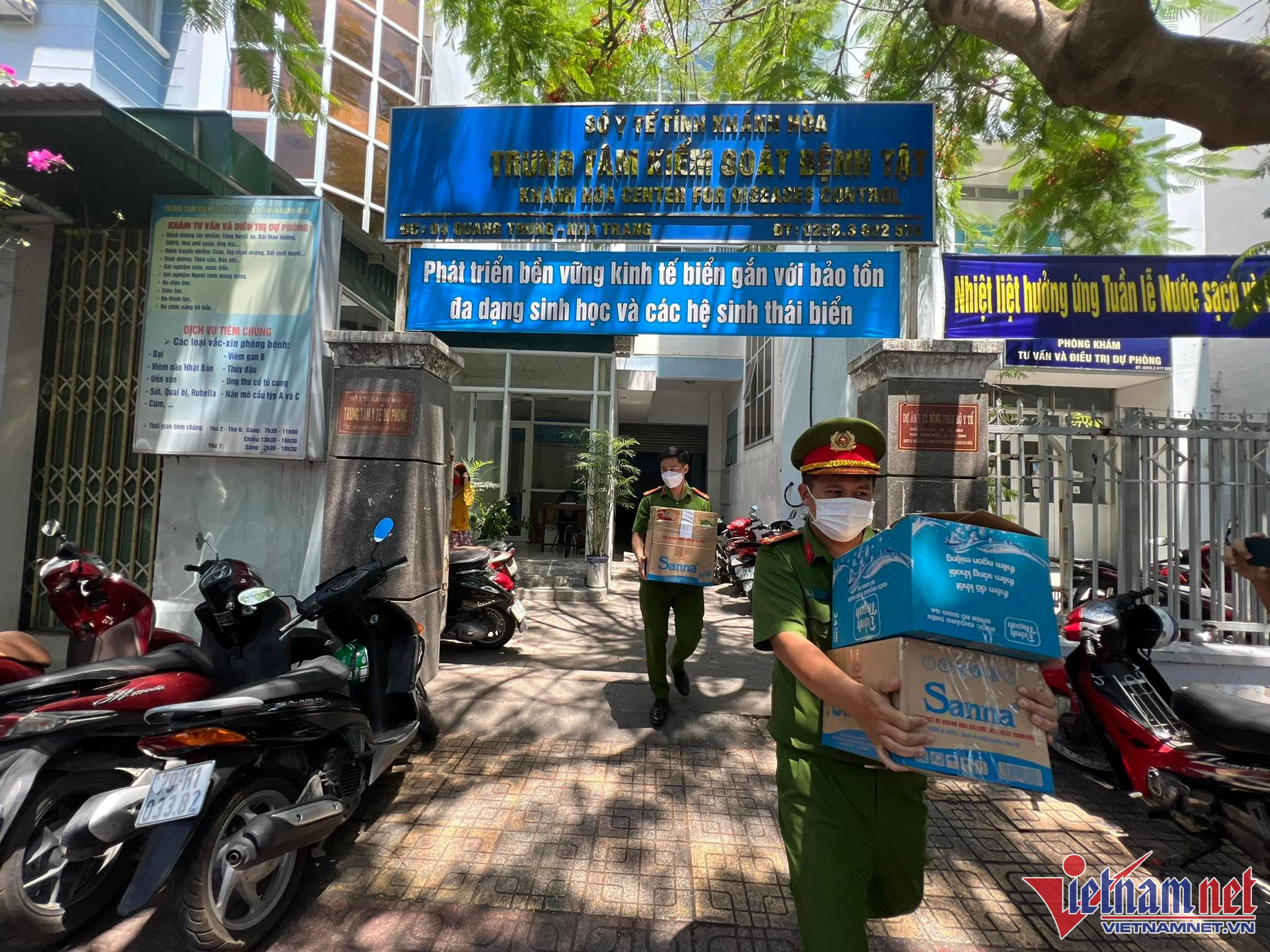 Khoảng 10h40, sau gần hai giờ làm việc, khám xét bên trong CDC Khánh Hoà, cảnh sát đưa nhiều thùng carton ra ngoài, đưa lên ô tô đậu sẵn phía trước.