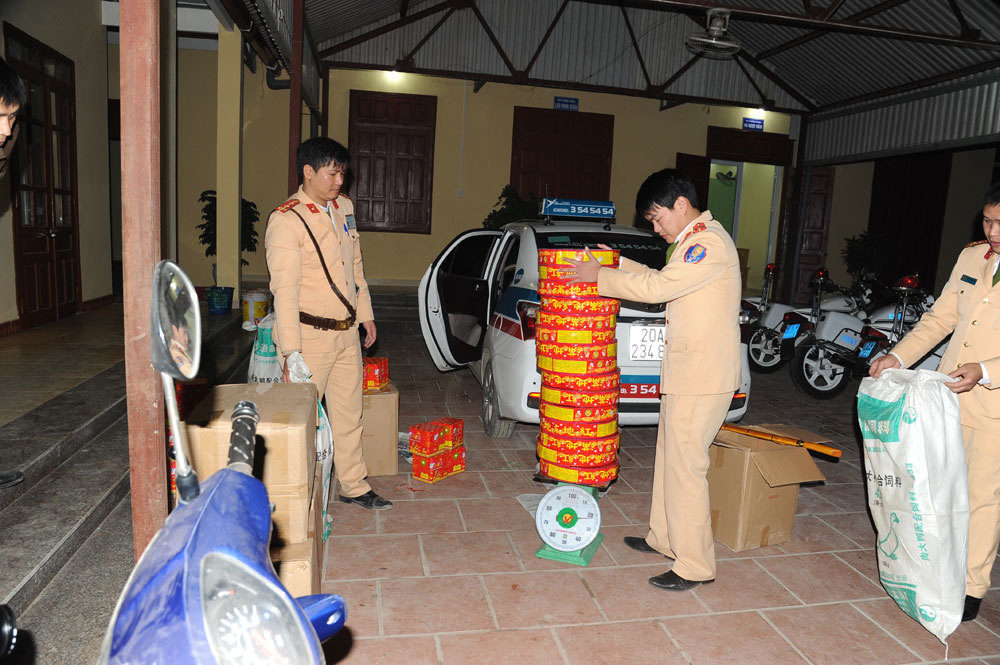 Trong khi lực lượng dừng xe tiến hành để kiểm tra hành chính người đàn ông đã bỏ chạy. Qua kiểm tra thực tế, trên xe có chở 160 kg pháo (cả bao bì) trong các thùng các tông và bao tải. Trong đó có 30 bánh pháo nổ vào 60 hộp pháo hoa loại 36 quả do TQ sản xuất và một thanh kiếm.