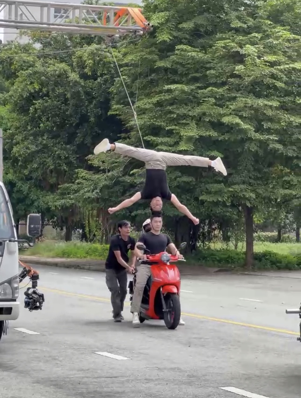 Về cảnh quay 2 nghệ sĩ thực hiện cảnh “chồng đầu” lên nhau khi xe máy đang di chuyển, Quốc Cơ cho biết, có buộc dây an toàn, người phía trên được cố định bởi 1 hệ thống cần cẩu… Khi đó, xe máy di chuyển rất chậm, có ê kíp đoàn làm phim theo sát.