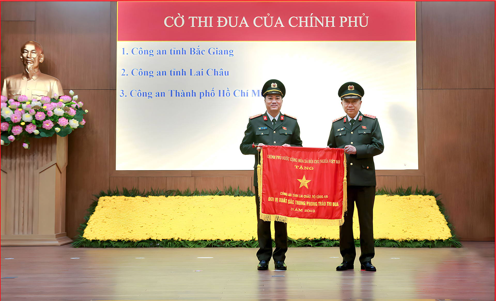 Đại tướng Tô Lâm - Ủy viên Bộ Chính trị, Bộ trưởng Công an (phải) trao Cờ thi đua của Chính phủ năm 2023 cho Công an tỉnh Lai Châu. Đại tá Nguyễn Viết Giang - Ủy viên Ban Thường vụ Tỉnh ủy, Giám đốc Công an tỉnh Lai Châu nhận Cờ thi đua của Chính phủ tại Hội nghị Công an toàn quốc lần thứ 79.