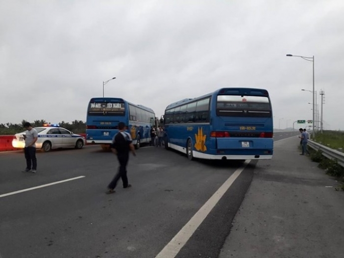 2 xe khách nằm chắn ngang cao tốc. Ảnh: otofun |
