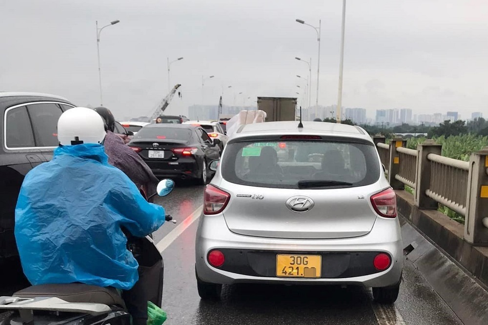 Nhiều người tham gia giao thông thời điểm này cho biết, nguyên nhân xảy ra ùn tắc là do nhiều ô tô đi lấn vào làn đường dành cho xe máy. Tài xế V.H chia sẻ hình ảnh chiếc ô tô hiệu Toyota Camry biển xanh đi vào làn xe máy trên cầu. Thời gian ghi nhận sự việc khoảng 9h13 cùng ngày.