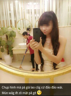 Cô gái trong ảnh cầm chiếc điện thoại ăn mặc khá sành điệu, phía sau là chị nhân viên vệ sinh đang lau nhà. “Chụp hình mà bà già lao công cứ đảo đảo hoài. Muốn quăng điện thoại vô mặt bà ghê” là dòng chữ được viết kèm bằng ngôn ngữ tuổi teen thể hiện sự khó chịu khi bị chị lao công cắt ngang khoảnh khắc “tự sướng” của cô.