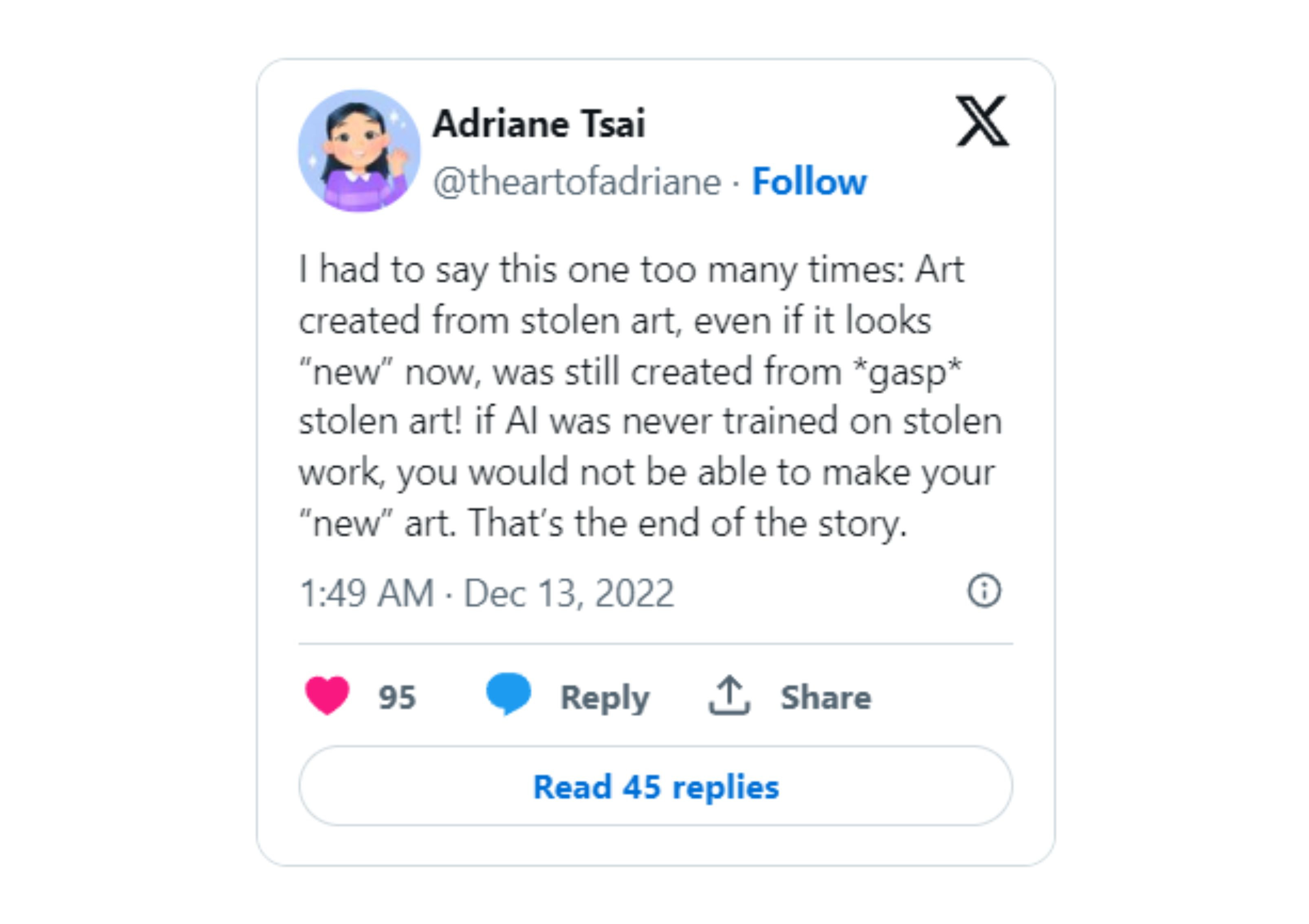“Với tôi, vấn đề lớn nhất của AI là chúng được huấn luyện dựa trên sức lực của người họa sĩ” Adriane Tsai, một họa sĩ khác đồng tình. “Chúng tôi tạo ra tác phẩm, tạo ra phong cách riêng, và chúng tôi chưa từng cho phép AI sử dụng”.