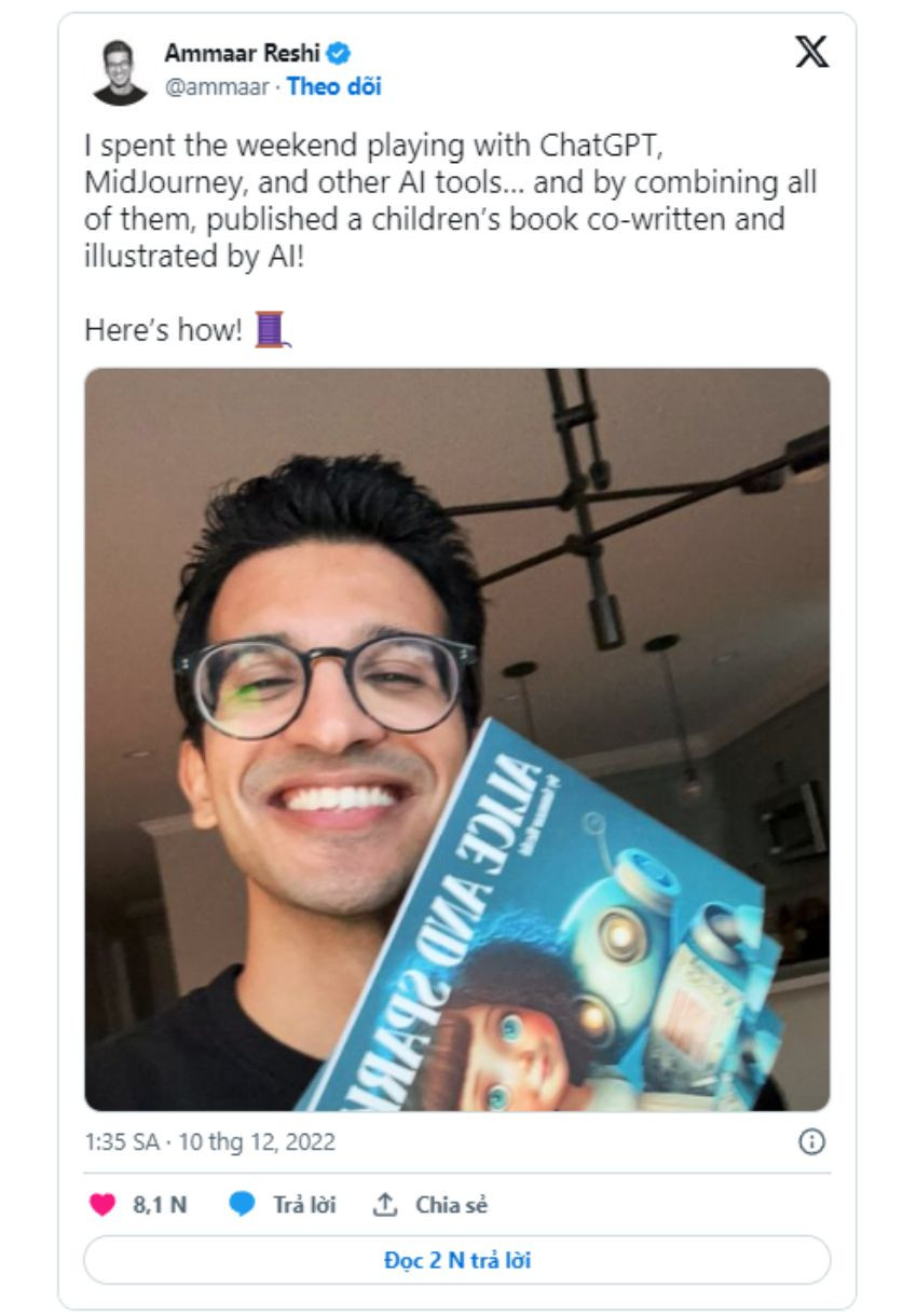 Ammar Reshi nảy ra ý tưởng sử dụng công nghệ AI để viết sách cho trẻ em khi đang chơi với ChatGPT, chatbot này được điều hành bởi công nghệ AI (trí tuệ nhân tạo) của OpenAI. Chỉ vài ngày sau, một quyển sách ảnh 12 trang “ra lò”, anh bắt đầu in ấn và bán trên sàn thương mại điện tử Amazon mà không cần đụng đến 1 cây bút hay tờ giấy nào.