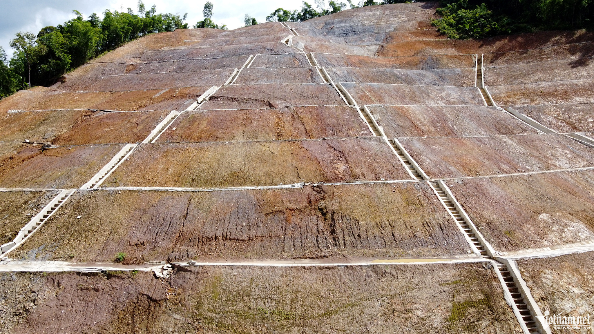 Theo ghi nhận, công trình trên được đơn vị thi công cắt thành 11 cơ, mặt cơ được ốp bằng những tấm bê tông. Ngoài ra còn có 3 rãnh thoát nước từ trên xuống. Hiện, các cơ, rãnh thoát nước đã bị đứt, gãy nghiêm trọng. Ngoài ra còn xuất hiện các cung trượt rộng từ trên xuống dưới.