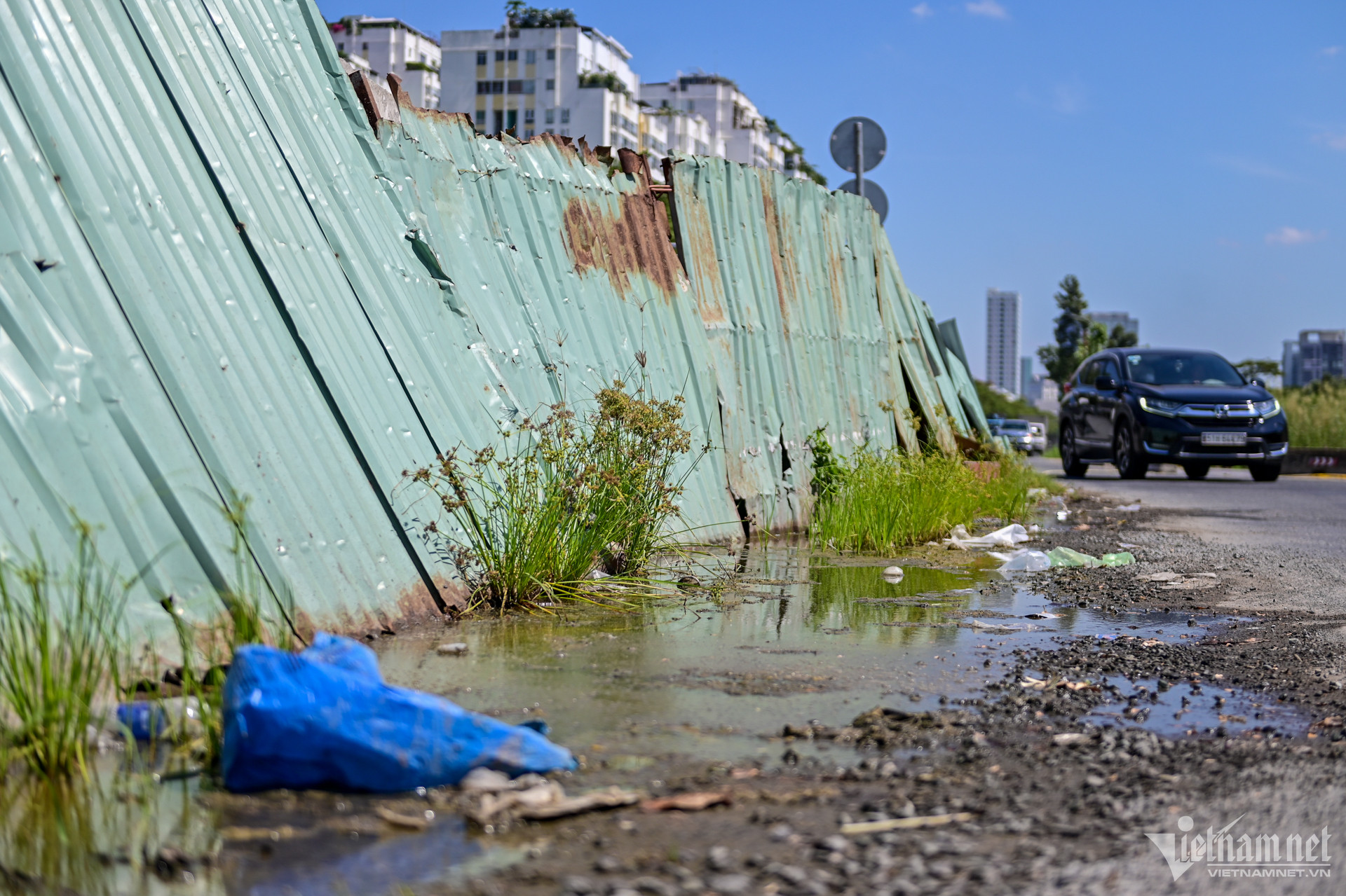 Bên ngoài công trình được quây tôn kín, mặt đường mặt đường nhiều đoạn nham nhở, xung quanh cỏ cây mọc um tùm.