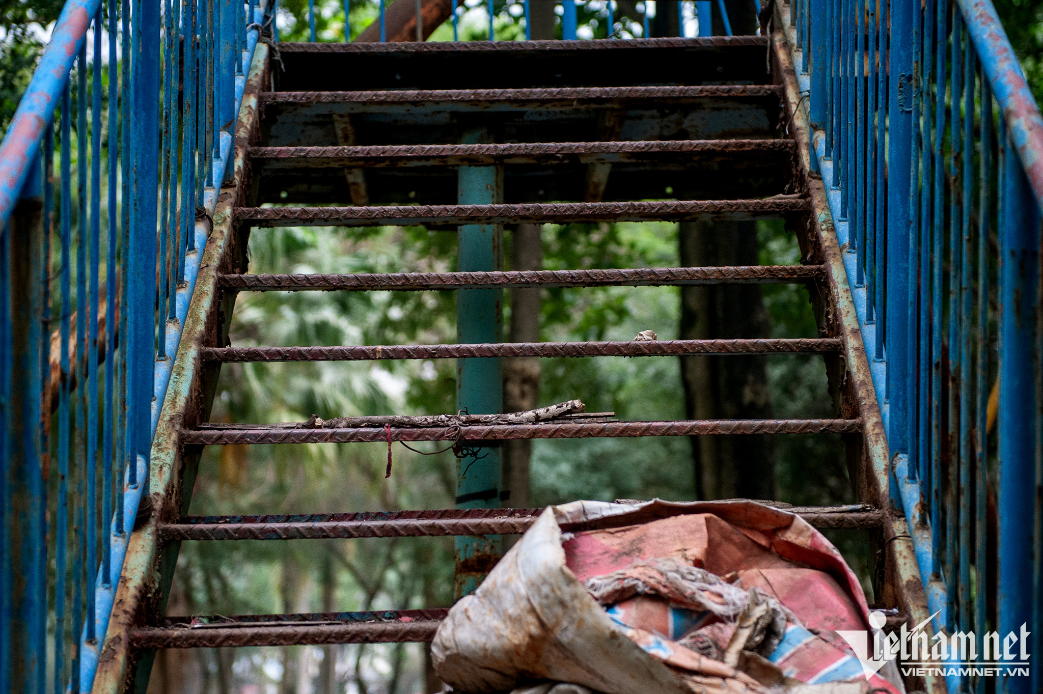 Hệ thống cầu thang sắt mục ruỗng, ống trượt, máng trượt bị hoen gỉ, mốc rêu xanh. Nhiều phần diện tích trở thành bãi tập kết rác.