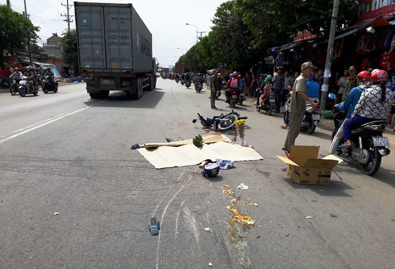 Sau cú va chạm mạnh, bà Huyền ngã xuống đường, bị bánh xe container chèn qua. Người con rể cũng bị thương nặng.