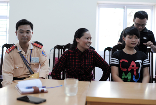 Thượng úy Nguyễn Duy Phương bên cạnh mẹ con thí sinh Tạ Thị Thu Huyền tại trụ sở đội CSGT số 4.