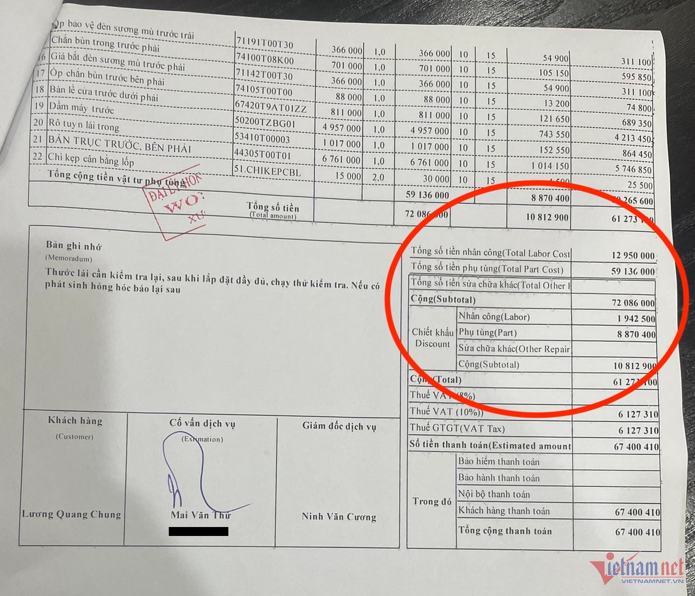 Hiện tại, anh Chung đã yêu cầu đại lý Honda Ninh Bình tạm dừng sửa xe để giữ nguyên hiện trạng, đồng thời chuẩn bị các tài liệu liên quan đến vụ tai nạn của mình để cung cấp cho CSGT.