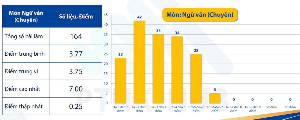 Các môn khác điểm thi thử lớp 10 cũng bết bát không kém. Chẳng hạn như môn Ngữ văn chuyên, có 164 bài thi thì 23 bài bị điểm từ 0 đến 2. 134 bài thi có điểm từ 5 trở xuống, chiếm tỷ lệ 81,7%. Điểm trung bình của môn Ngữ văn chuyên là 3,77.