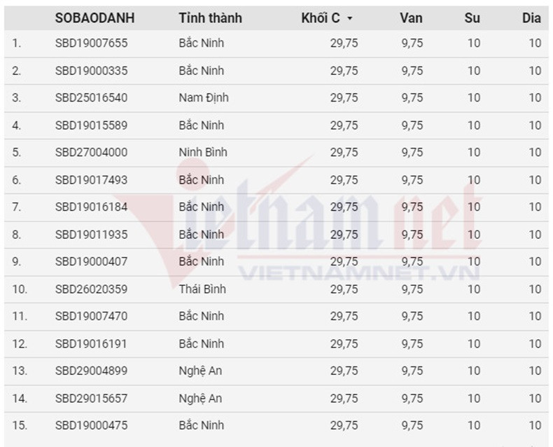 Cũng theo thống kê, trong tổng số 19 thí sinh cùng là thủ khoa khối C (Văn, Lịch sử, Địa lý) năm nay (khi cùng tổng điểm) có đến 13 thí sinh đến từ Bắc Ninh.