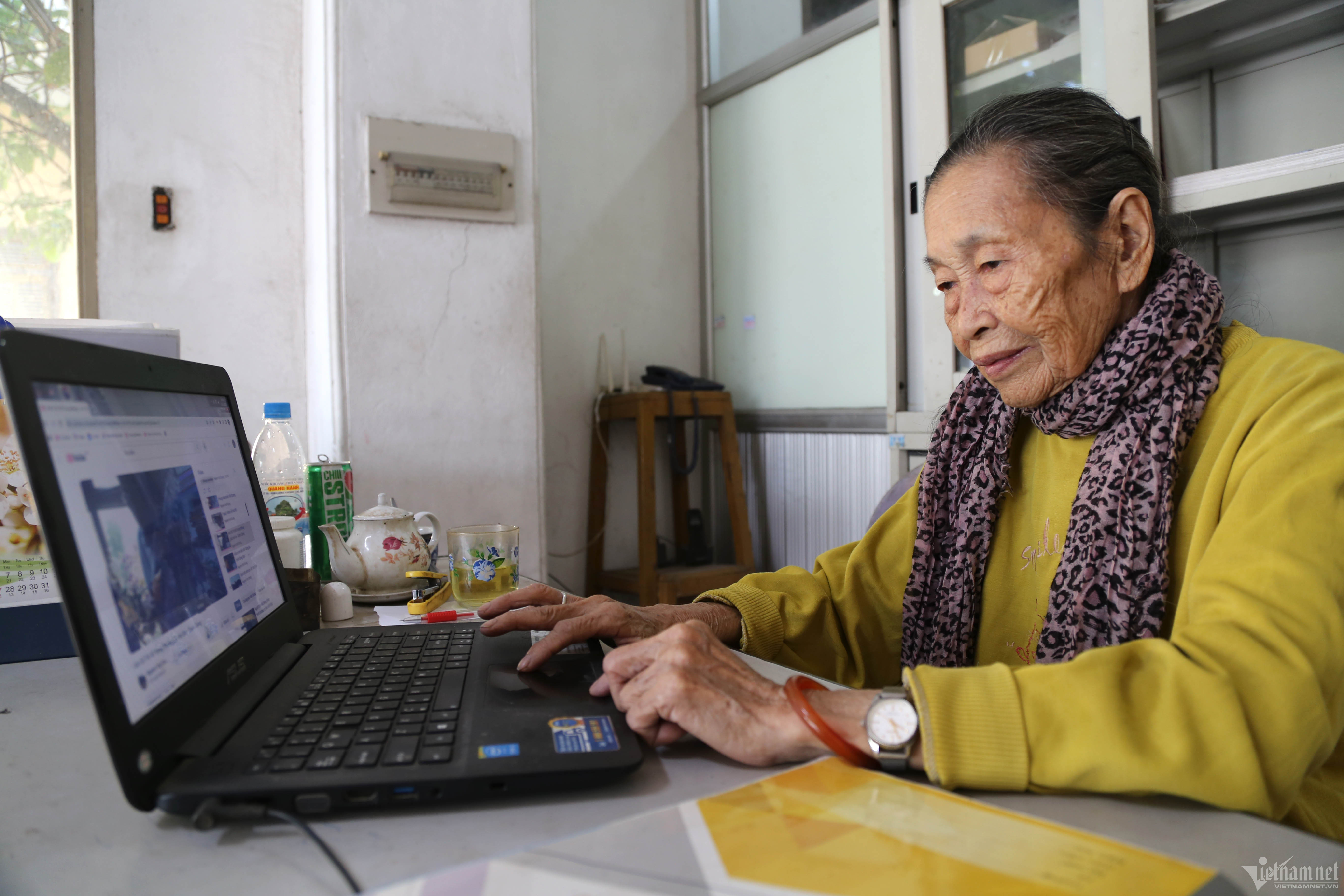 Khác xa với suy nghĩ của tôi về một cụ bà 83 tuổi, lưng còng, tóc bạc và móm mém, cụ Dung vẫn ngồi dùng laptop để nghe nhạc và xem mạng xã hội.