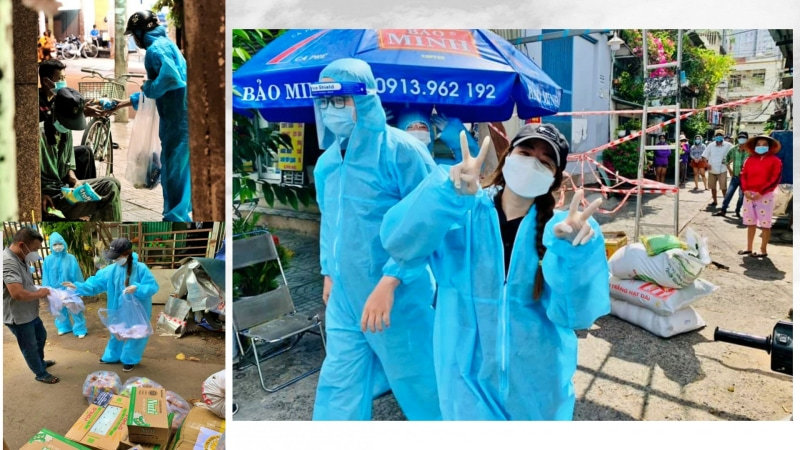 | Cô gái trong những lần đi hỗ trợ, phát thực phẩm cho khu phong tỏa cách ly thời điểm TP.HCM chống dịch Covid-19. |