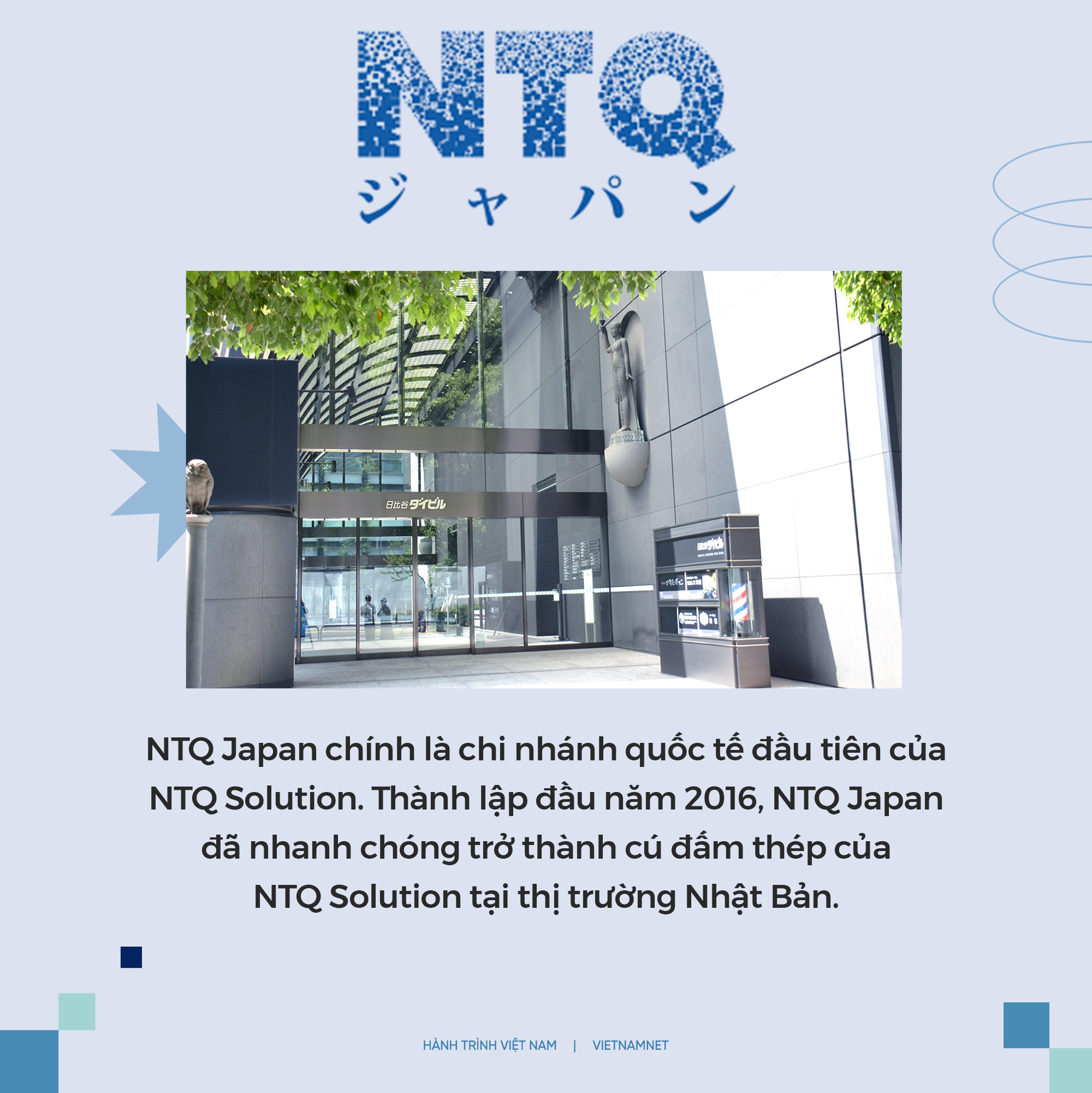 NTQ Japan là chi nhánh quốc tế đầu tiên của NTQ Solution. Thành lập đầu năm 2016, NTQ Japan đã nhanh chóng trở thành "cú đấm thép" của NTQ Solution tại thị trường Nhật Bản. Sau 7 năm thành lập và phát triển, NTQ Japan đã và đang khẳng định vị thế công ty công nghệ uy tín dẫn đầu về sản xuất phần mềm và cung cấp các giải pháp chuyển đổi số, là đối tác tin cậy của nhiều công ty, tập đoàn lớn tại Nhật Bản và quốc tế.