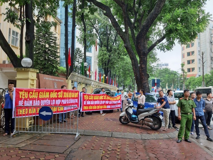 | Sau cuộc đối thoại, nhiều cư dân tập trung căng băng rôn ngay trước cổng Sở Xây dựng Hà Nội. |