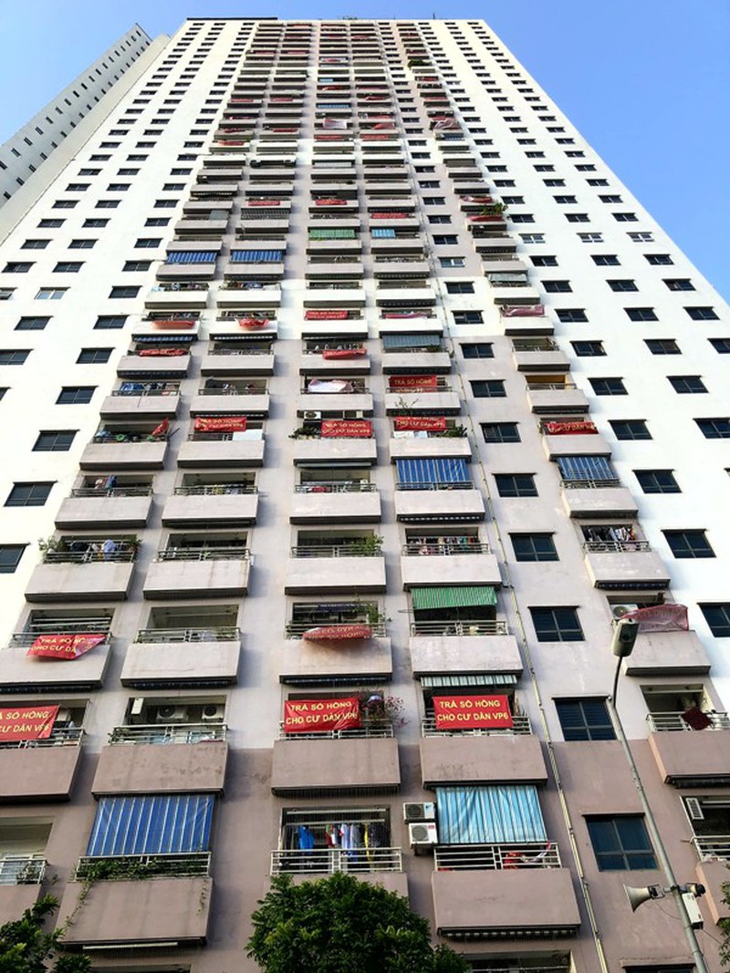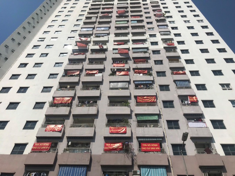 | "Trả sổ hồng cho cư dân VP6" là nội dung của nhiều băng rôn được treo khắp các ban công của mỗi căn hộ tại tòa nhà chung cư VP6. |