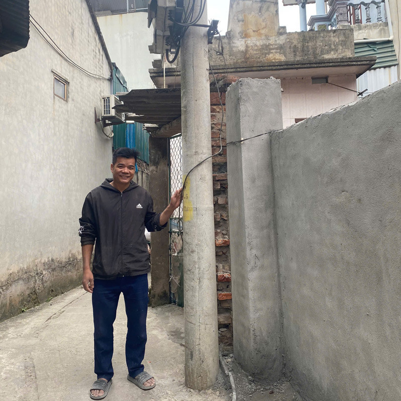 Nhà anh Quân ở sâu trong ngõ, cách nhà cụ Đương khoảng 200m. Anh bắt đầu thi công xây nhà mới từ tháng 6/2024. Vì đoạn qua nhà cụ Đương quá hẹp, xe ba bánh không thể chạy qua, anh phải dùng xe rùa để chở vật liệu xây dựng từ đầu ngõ vào.