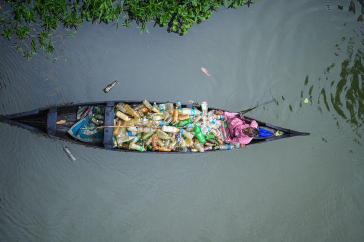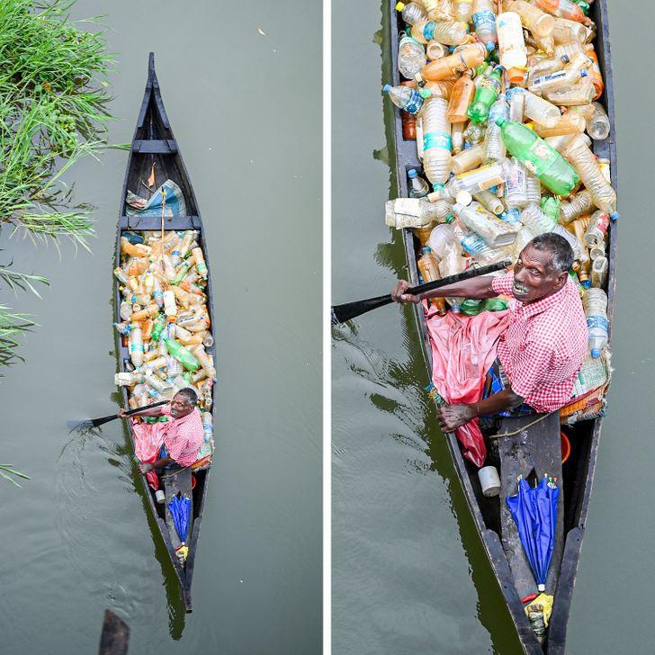 Mặc dù, số phận kém may mắn nhưng suốt 15 năm qua ông vẫn thầm lặng chèo thuyền đi nhặt rác, chai nhựa trên hồ Vembanad (Kerala, Ấn Độ).