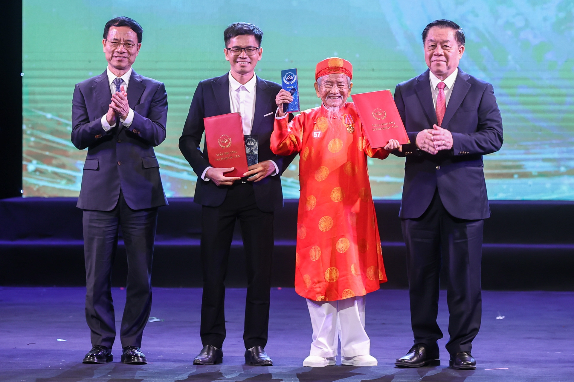 Trưởng ban Tuyên giáo Trung ương Nguyễn Trọng Nghĩa và Bộ trưởng Bộ Thông tin và Truyền thông Nguyễn Mạnh Hùng trao giải A cho nhà nghiên cứu 104 tuổi Nguyễn Đình Tư.
