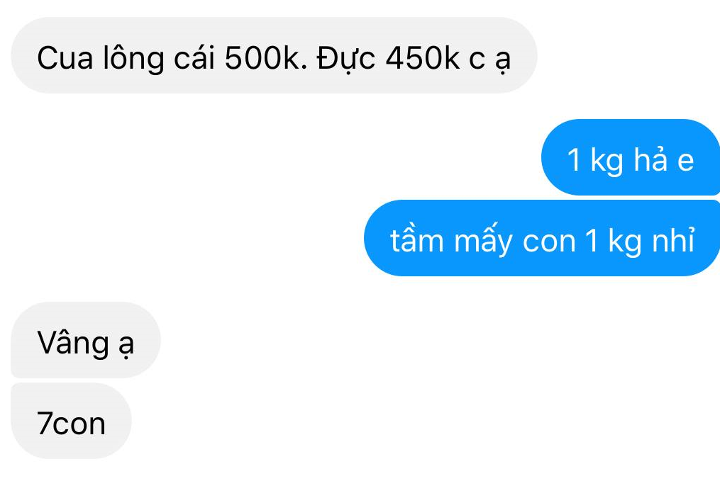 | Và nếu mua theo cân, giá cua lông cái là 500K/cân và đực là 450K/cân. Ảnh chụp màn hình. |