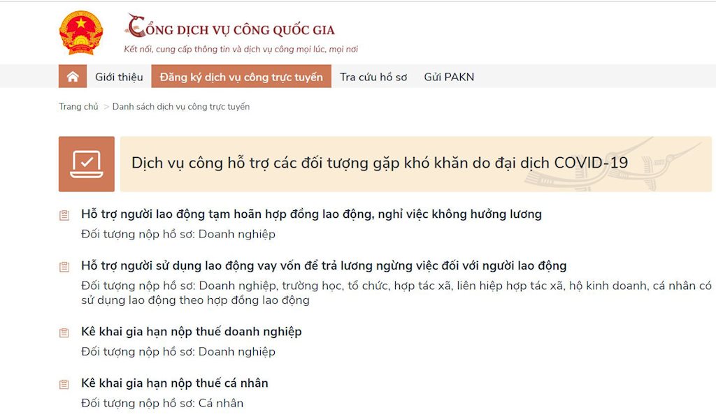 Bốn nhóm dịch vụ công trực tuyến hỗ trợ các đối tượng gặp khó khăn do đại dịch Covid-19 được cung cấp trên Cổng dịch vụ công quốc gia gồm: Hỗ trợ người lao động tạm hoãn hợp đồng lao động, nghỉ việc không hưởng lương (đối tượng nộp hồ sơ là doanh nghiệp); Hỗ trợ người sử dụng lao động vay vốn để trả lương ngừng việc đối với người lao động (đối tượng nộp hồ sơ là doanh nghiệp, trường học, tổ chức, hợp tác xã liên hiệp hợp tác xã, hộ kinh doanh, cá nhân có sử dụng lao động theo hợp đồng lao động); Kê khai gia hạn nộp thuế doanh nghiệp (đối tượng nộp hồ sơ là doanh nghiệp); Kê khai gian hạn nộp thuế cá nhân (đối tượng nộp hồ sơ là cá nhân).