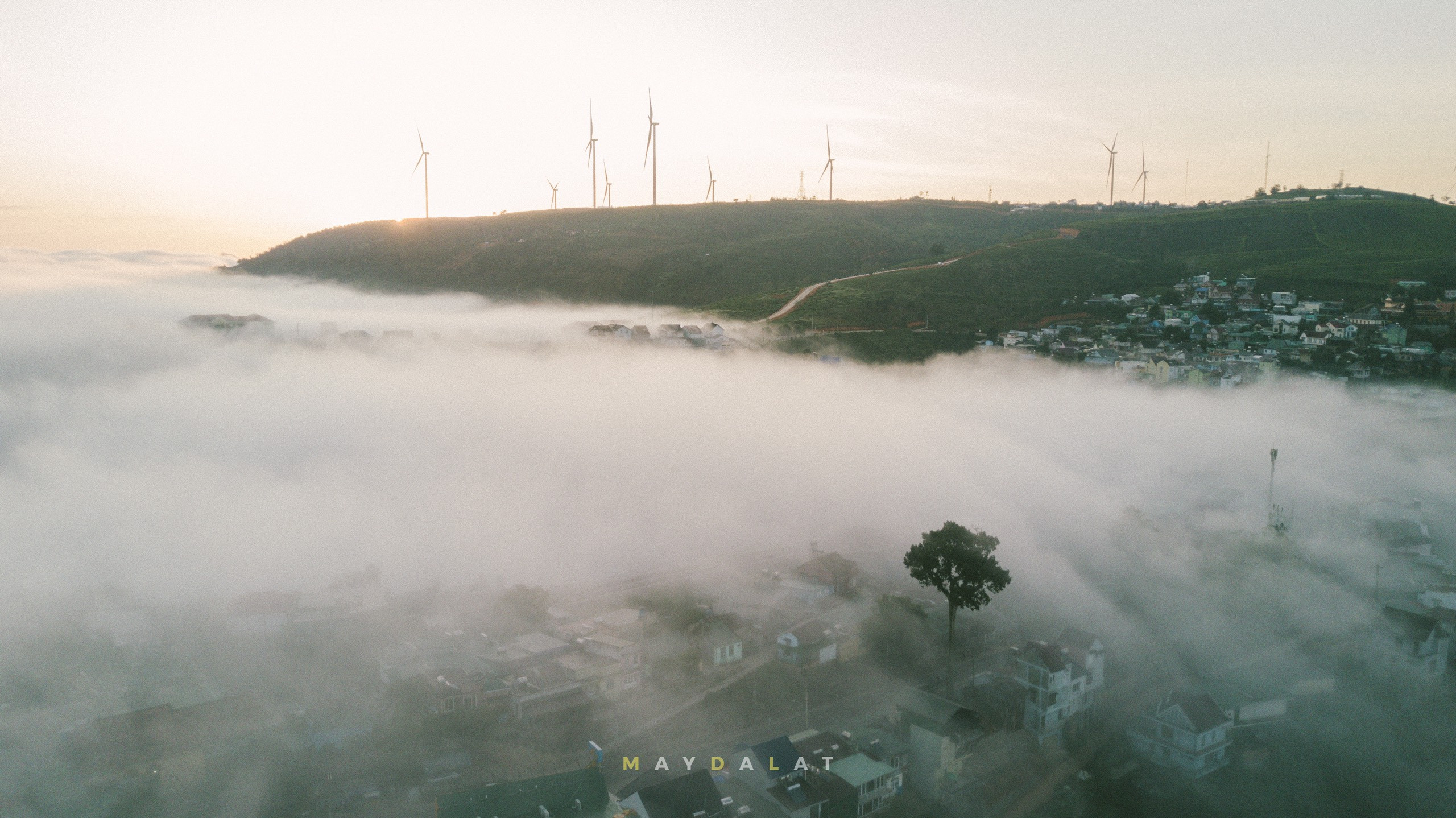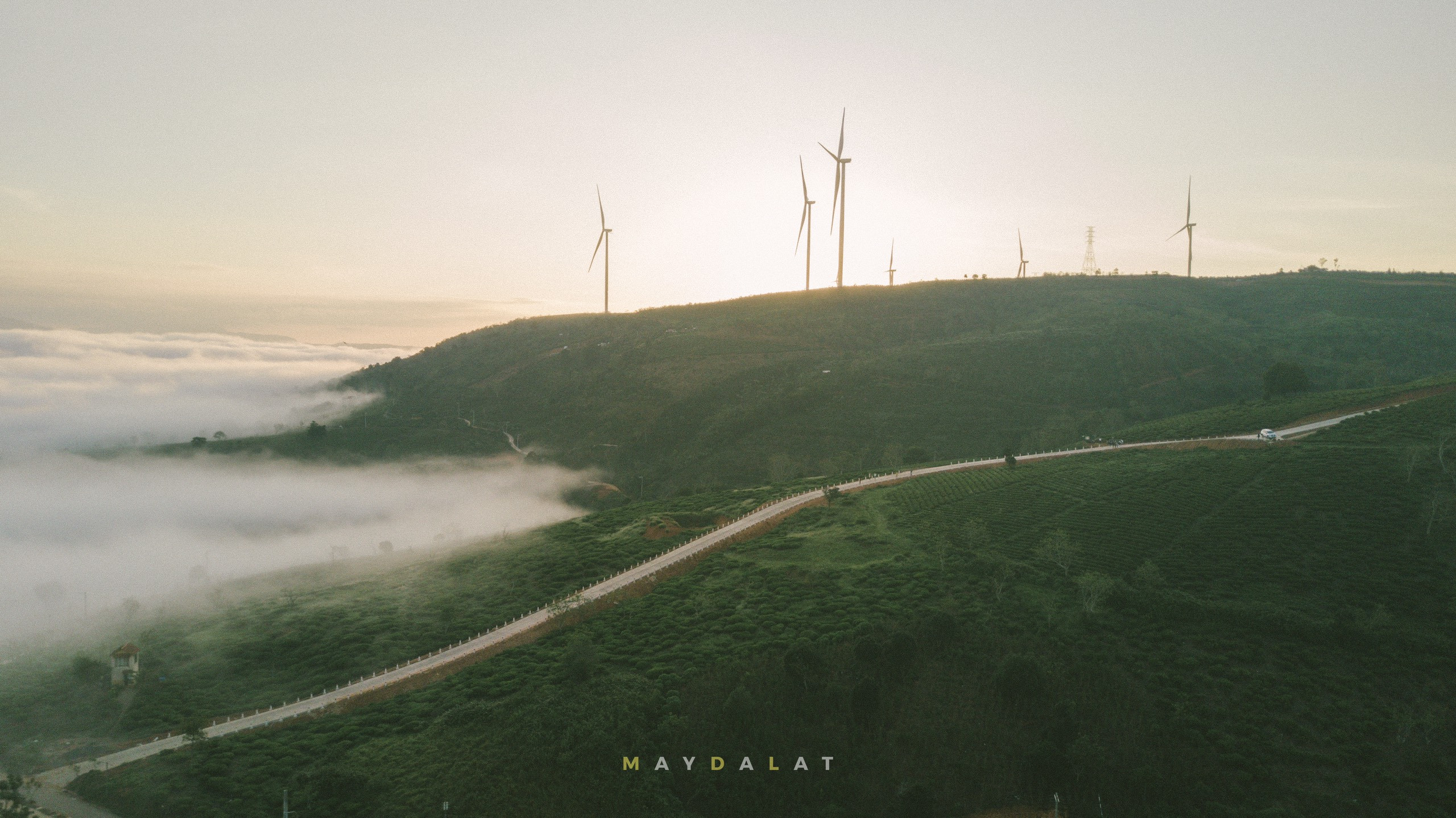 Xung quanh cung đường Cầu Đất được bao phủ bởi những đồi chè, các khu điện gió và những mái nhà xinh xắn nằm xen kẽ.