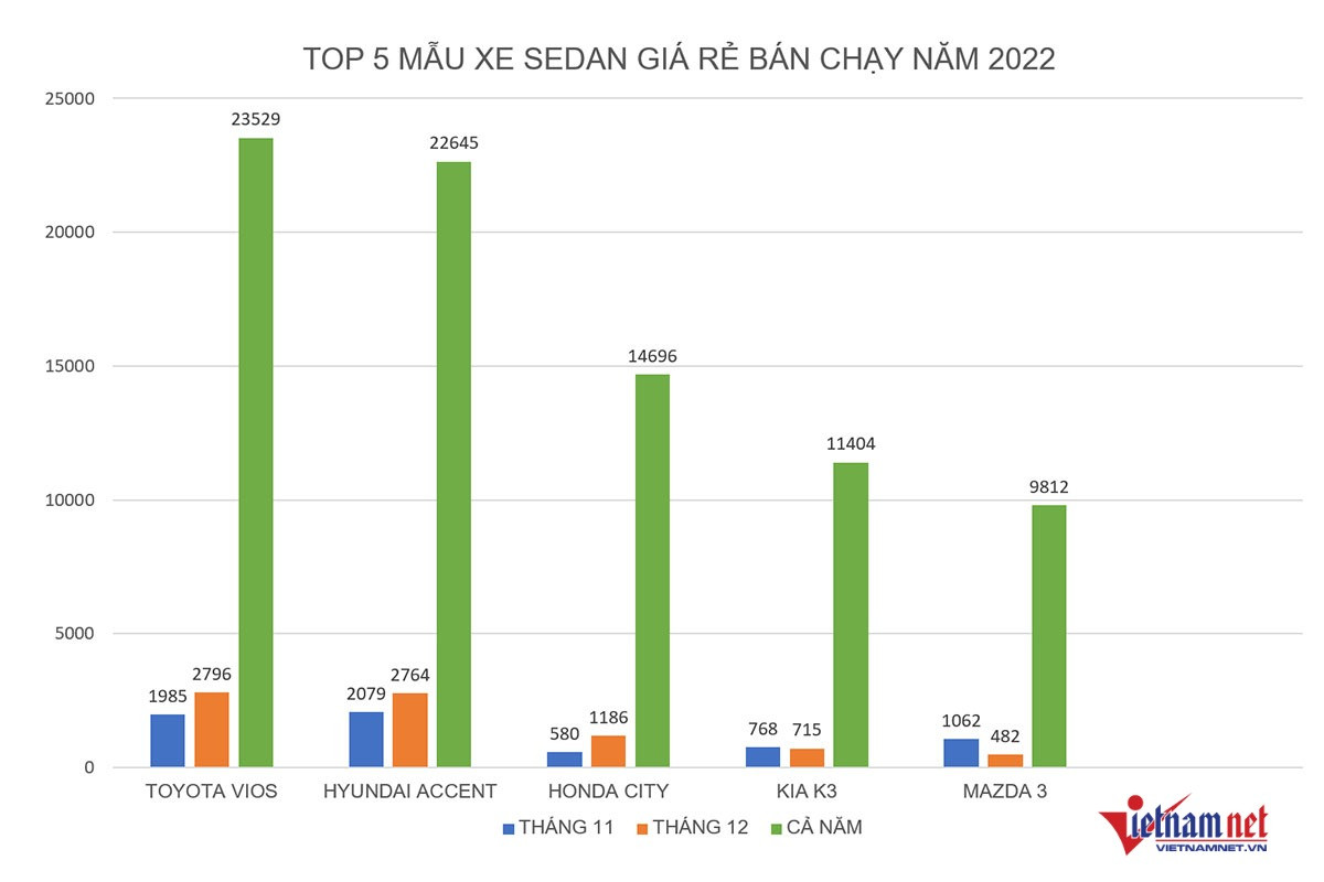Theo số liệu báo cáo từ Hiệp hội các nhà sản xuất ôtô Việt Nam (VAMA), trong tháng 12 và cả năm 2022, doanh số bán xe ô tô trong phân khúc sedan giá rẻ có sự xáo trộn, chủ yếu ở Top 3 trở xuống. Trong khi, 2 cái tên là Hyundai Accent và Toyota Vios vẫn ghi nhận sức tăng trưởng mạnh nhưng kết quả cuối vẫn thuộc về mẫu xe đến từ Nhật Bản.